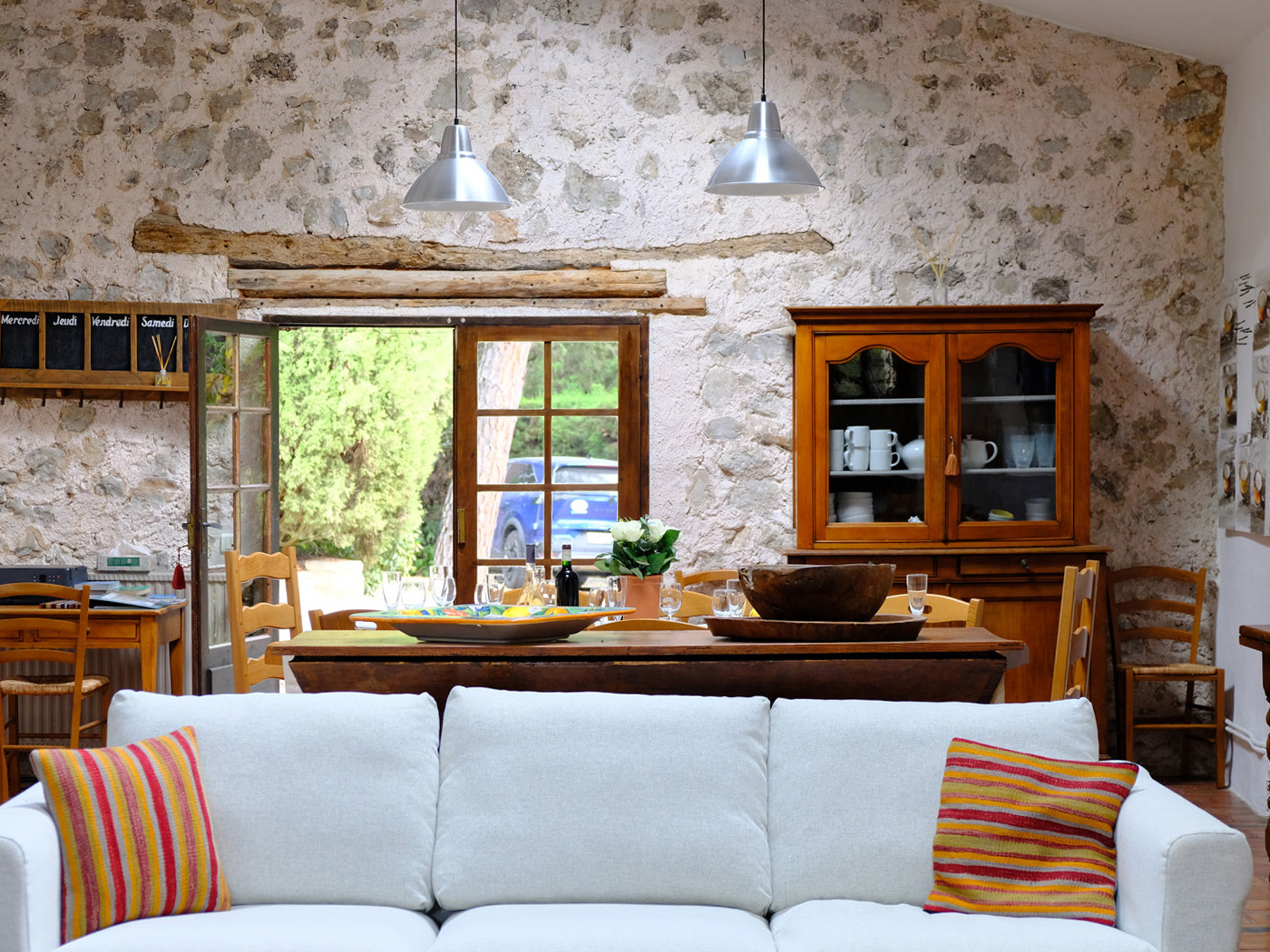 In de woonkamer bevindt zich een comfortabele zithoek met een grote open haard. In het verlengde van de zithoek staat een eikenhouten eettafel. Waarschijnlijk eet u vooral buiten op het terras in het verlengde van de keuken. Authentieke elementen zoals de molensteen en het grote houten waterrad herinneren aan de geschiedenis van deze villa. Heel mooi om te zien hoe de eigenaren deze woning hebben omgetoverd tot een comfortable vakantievilla in het hart van de Provence.