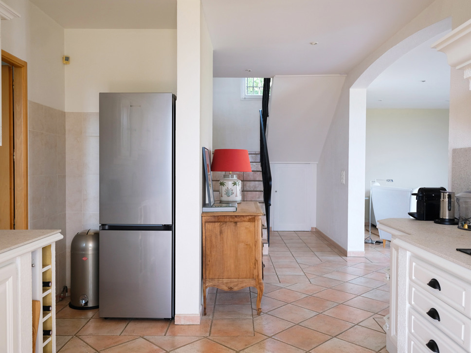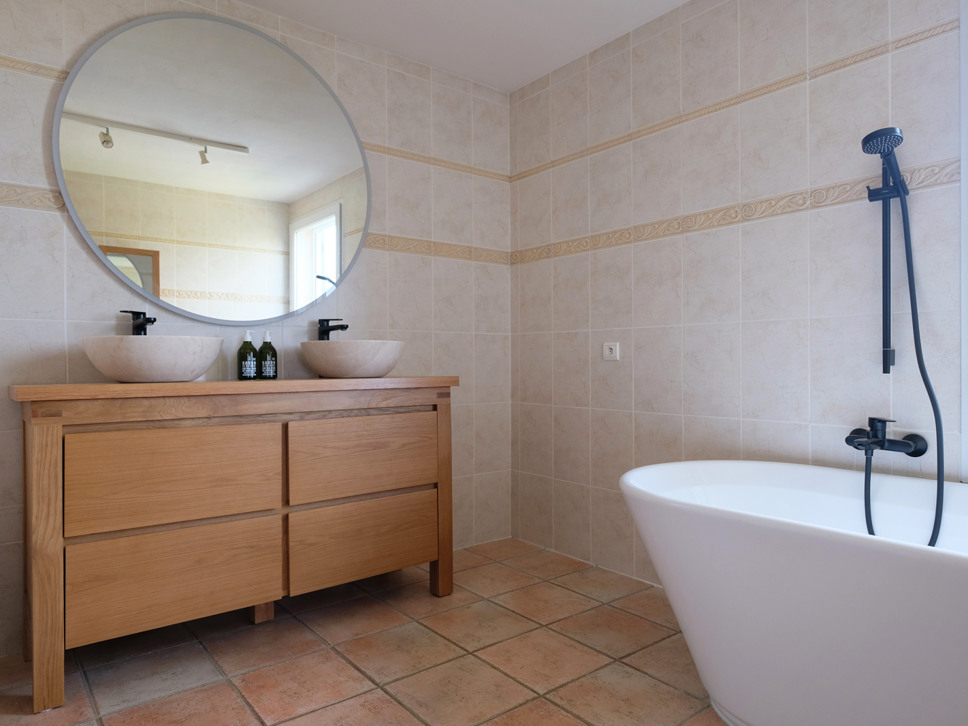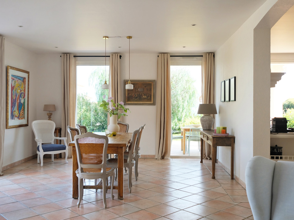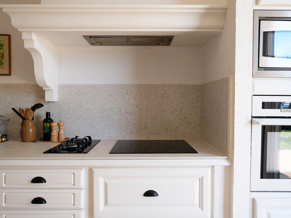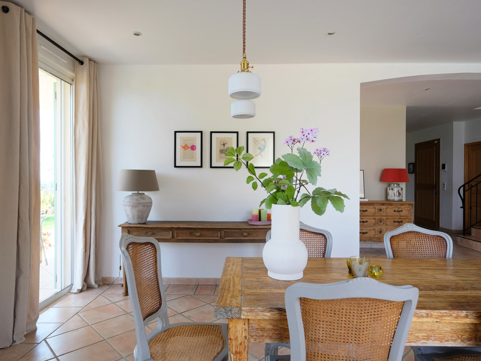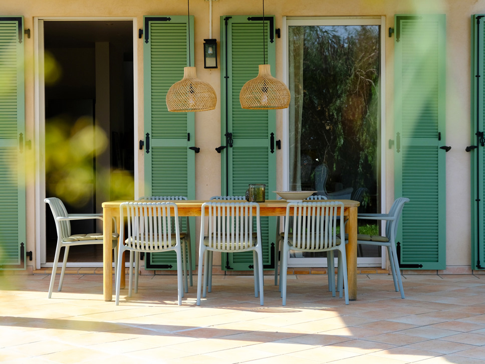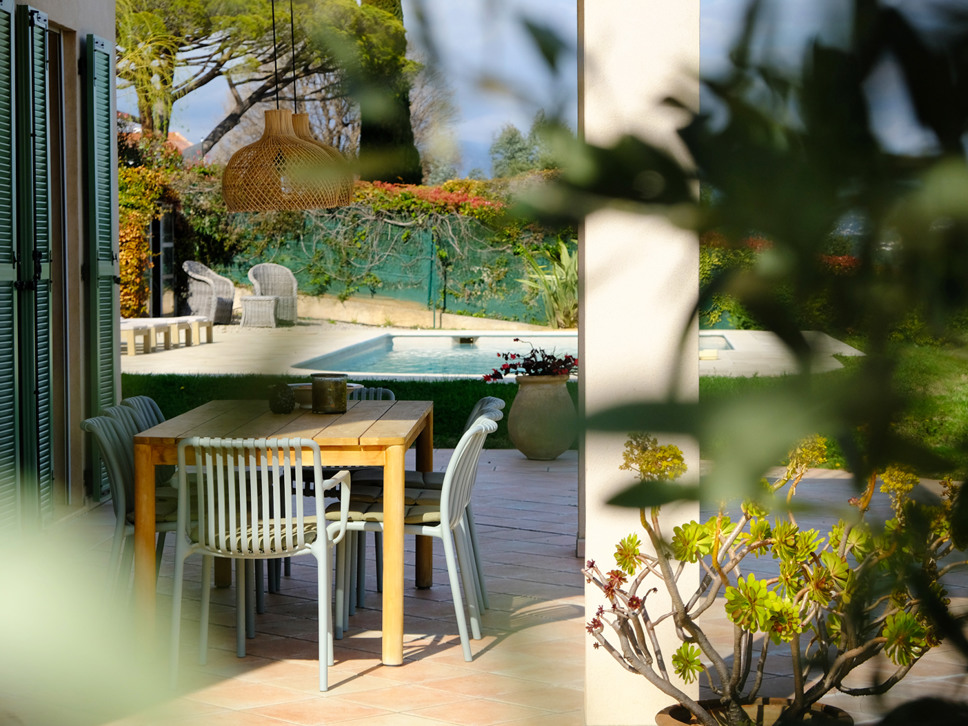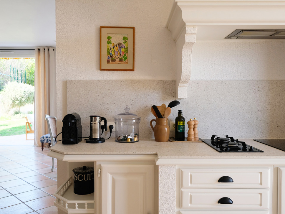 De keuken geeft toegang tot een tweede, overdekt terras met een eettafel voor zes personen. Een fijne plek om in de schaduw te genieten van ontbijt, lunch of diner.