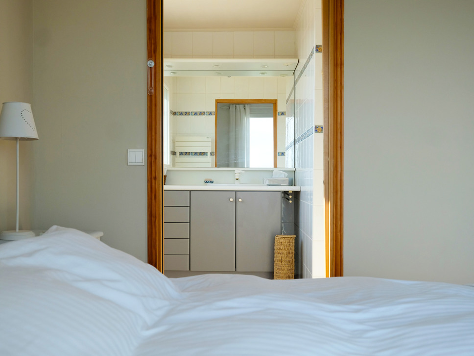 Slaapkamer 3, gelegen op de 1e verdieping , is een slaapkamer met een tweepersoonsbed (160x200) en een kinderbed. Deze slaapkamer maakt gebruik van een van de drie en-suite badkamers.Slaapkamer 4, op de begane grond, hier staat een tweepersoonsbed (160x200). De badkamer is en-suite (douche, wastafel en toilet)