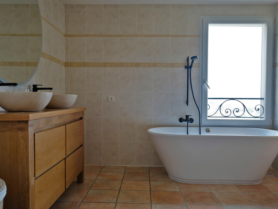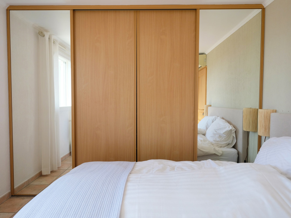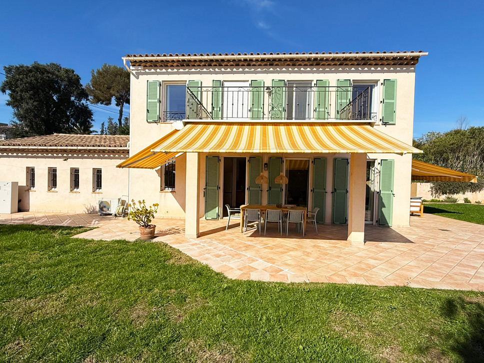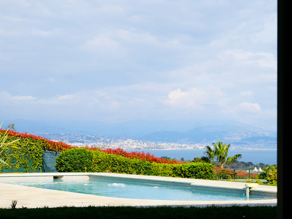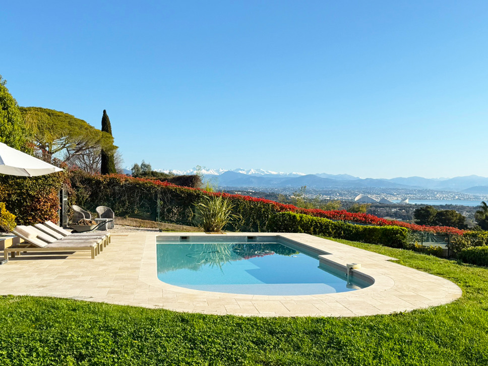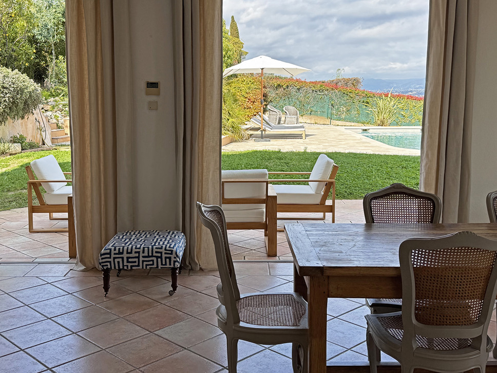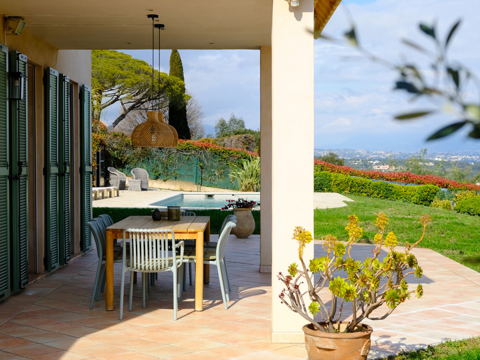 Grenzend aan de living bevindt zich een ruim terras met zonwering, dat via grote schuifpuien direct in verbinding staat met binnen. Dit zorgt voor een prettige lichtinval en een open gevoel, met uitzicht op de tuin, de Alpen en natuurlijk de Middellandse Zee voor het bruisende Nice. Met name in de avond als het donker is is het extra genieten van de vele lichtjes in de verte.