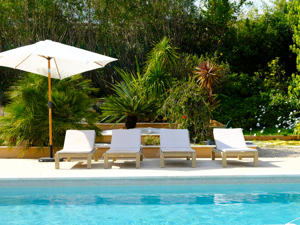 Het privézwembad van 10 x 4 meter (diepte van 0.2 naar 2.0 m) ligt centraal in de tuin en wordt omgeven door een zonneterras en een ruim grasveld met ligbedden en een parasol.