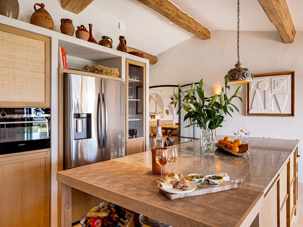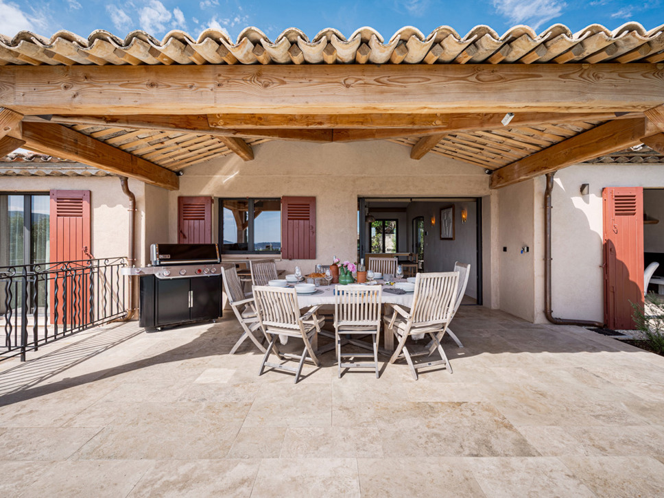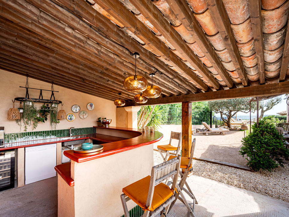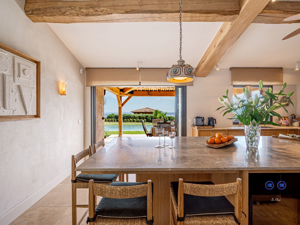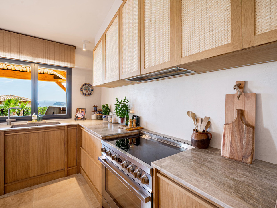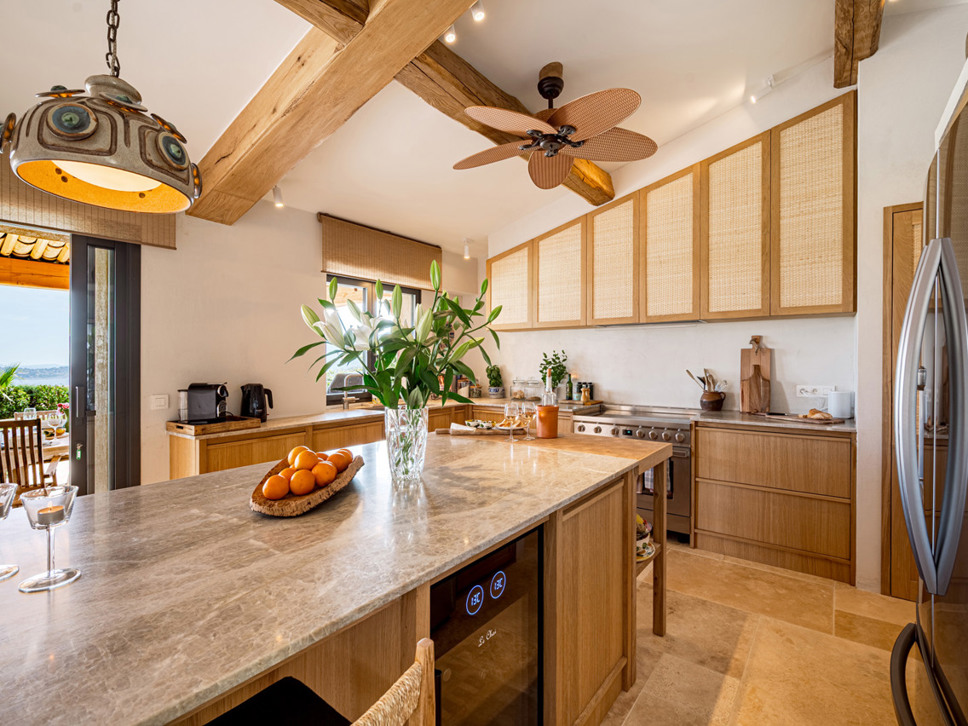 De keuken biedt middels grote schuifpuien toegang tot het overdekte terras met eettafel en een royale Weber gas-bbq. Hier geniet u van het uitzicht op zee en ook op het zwembad.
