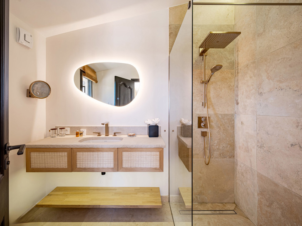 De villa beschikt over vier comfortabele slaapkamers, elk met een eigen luxe en-suite badkamer en royale inbouwkasten. In alle slaapkamers is airconditioning aanwezig.Op de benedenverdieping bevinden zich twee slaapkamers: Slaapkamer 1 is een ouderslaapkamer en deze biedt een tweepersoonsbed (180x200) en een luxe en-suite badkamer voorzien van wastafel, W.C. en ligbad met douche. Deze slaapkamer biedt een eigen terras met een leuk zitje. Slaapkamer 2 ook met tweepersoonsbed (180x200) en en-suite badkamer met wastafel, W.C. en luxe inloopdouche.