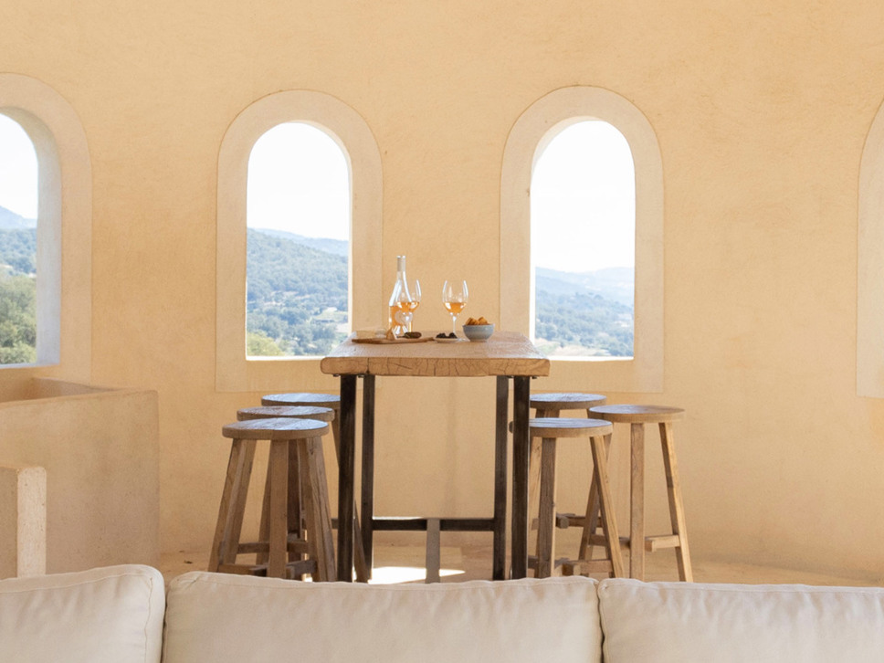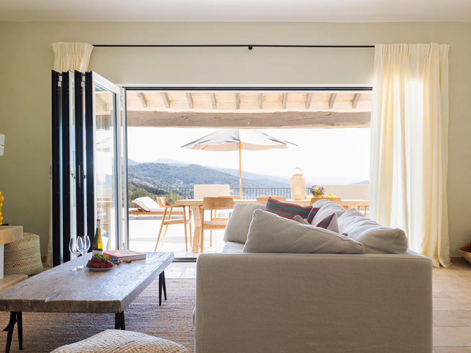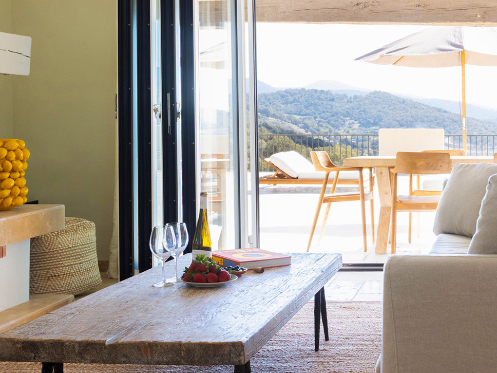 De living is eigentijds en luxe ingericht met meerdere fraaie zitmeubels. Een open haard is aanwezig, leuk om hier tijdens het voor- en naseizoen gebruik van te maken. Vanuit de living heeft u een prachtig zicht over het terras en zwembad richting de Middellandse Zee.