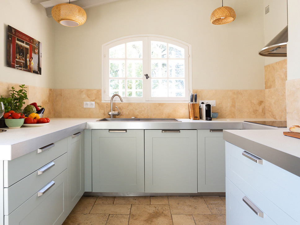 De keuken - gelegen direct naast de living en met toegang tot het terras - is modern en compleet ingericht. Zo is deze o.a. voorzien van een grote Amerikaanse koelkast, Nespresso koffiezetapparaat, waterkoker, oven, magnetron en vaatwasser. Alle keukenapparatuur is beschikbaar zoals broodrooster, keukenmixer, waterkoker, blender. Via een grote glazen schuifpui heeft u direct vanuit de living en keuken toegang tot het ruime terras met uitzicht op zee.