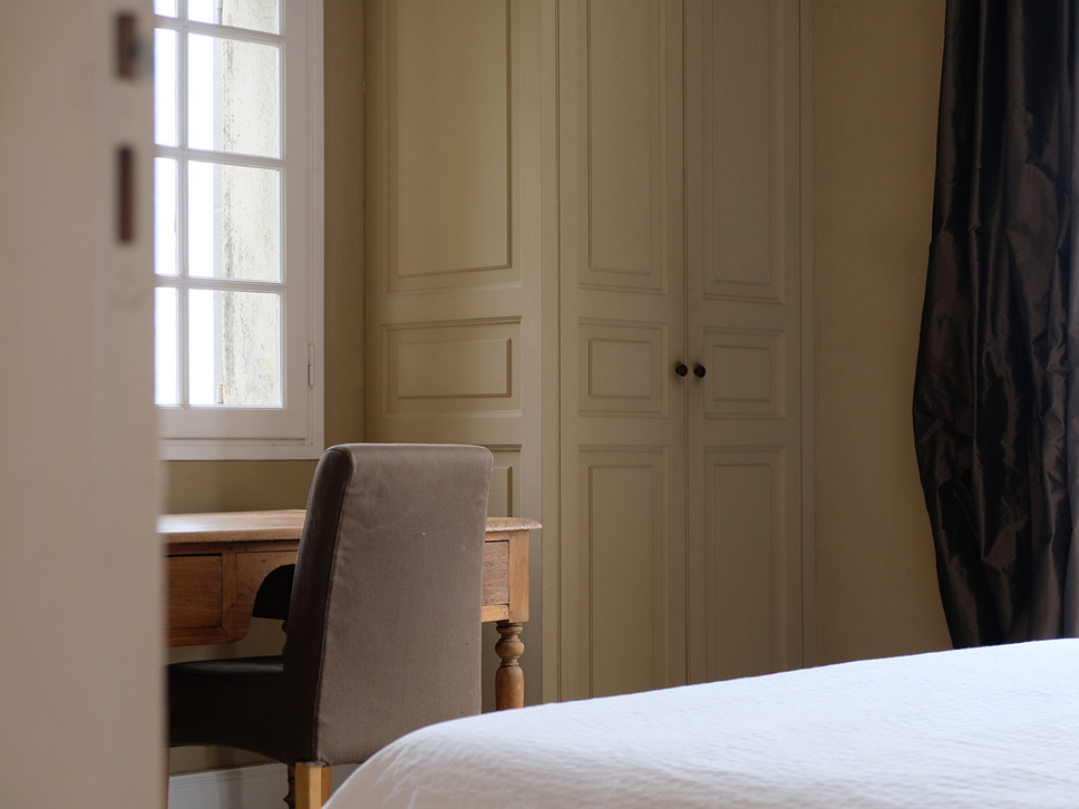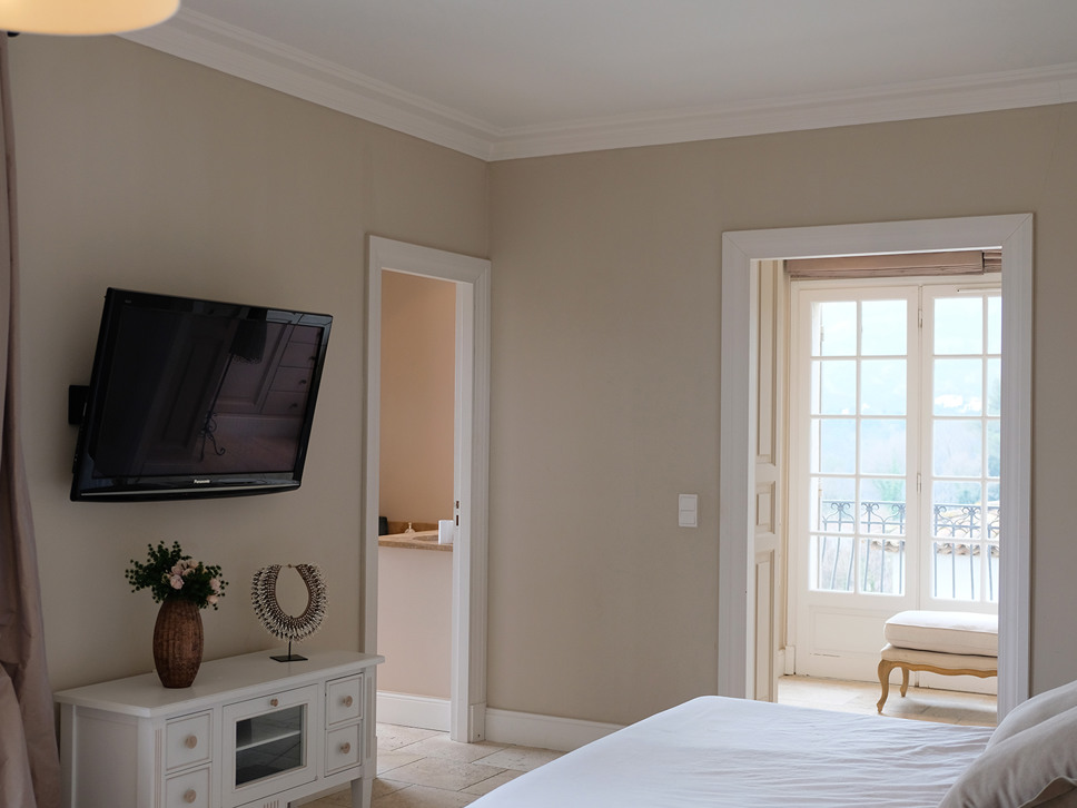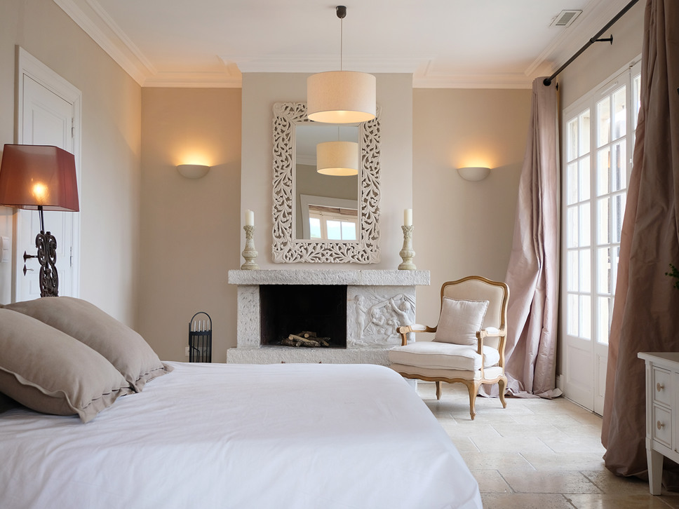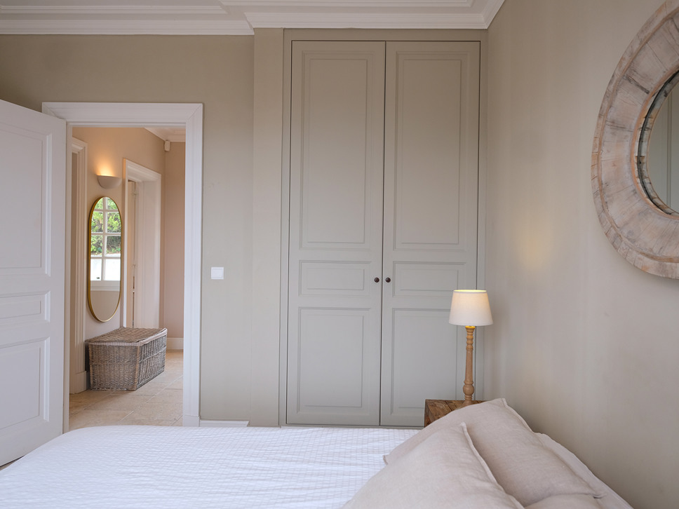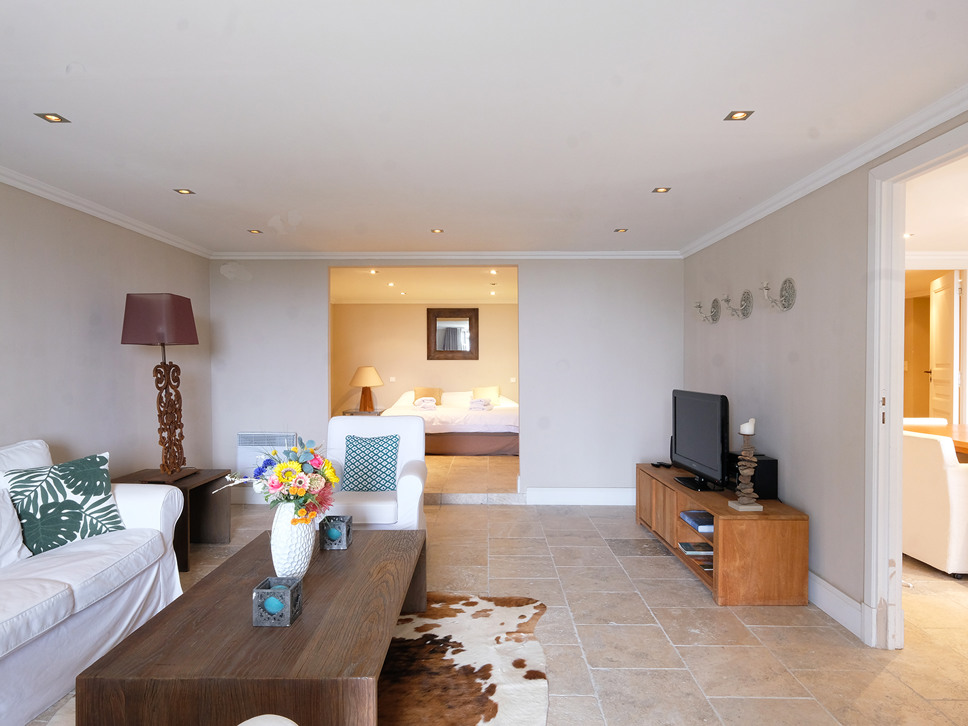 Slaapkamer 1, gelegen op de 2e verdieping, is de ouderslaapkamer is zeer royaal en feitelijk een heuse suite. Met tweepersoonsbed (180x200), open haard, en-suite badkamer met ligbad, WC en douche, alsook een prachtige met houten panelen afgewerkte walk-in closet en toegang tot het royale balkon aan de zeezijde. Voorzien van airconditioning.