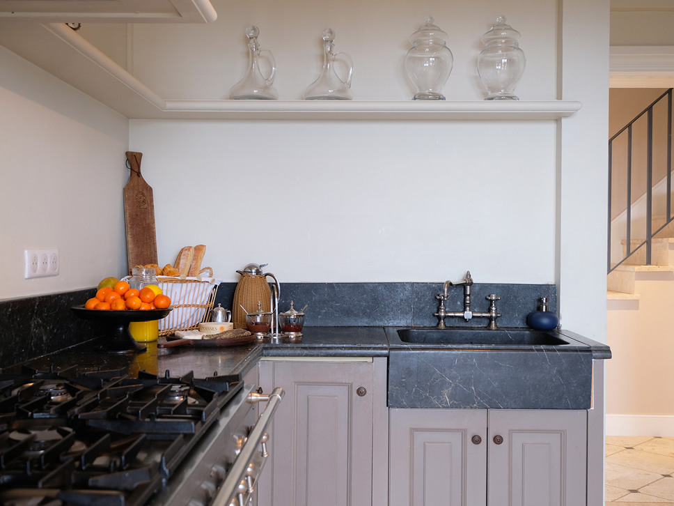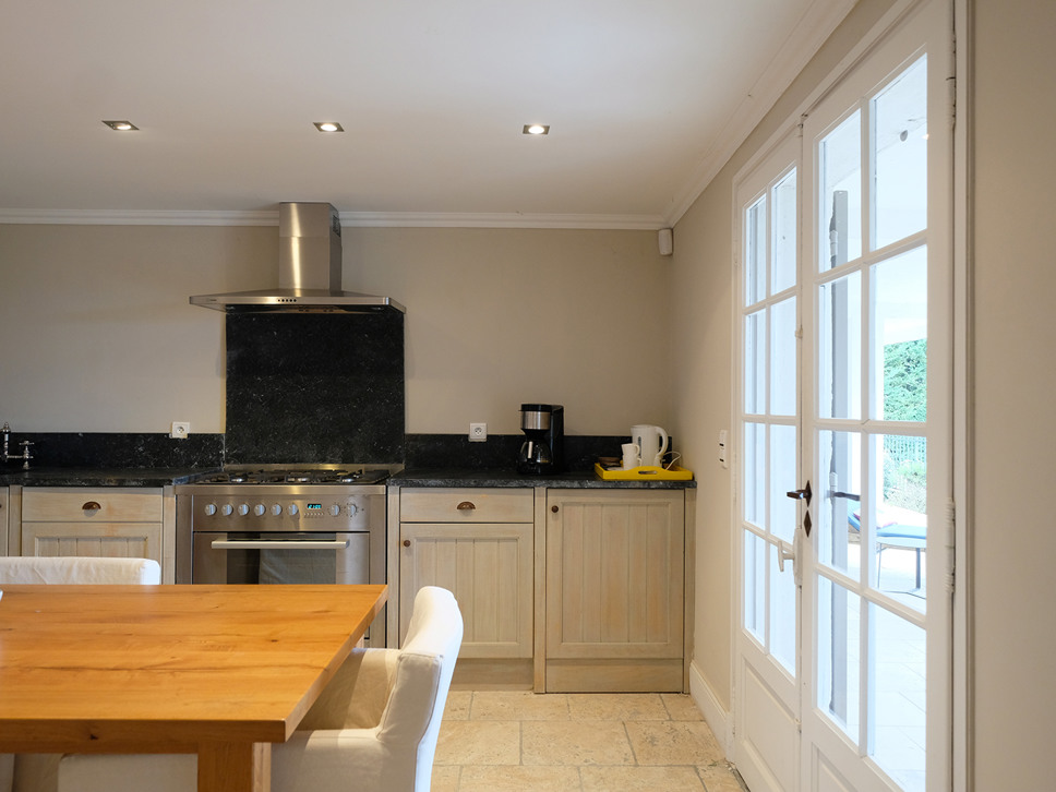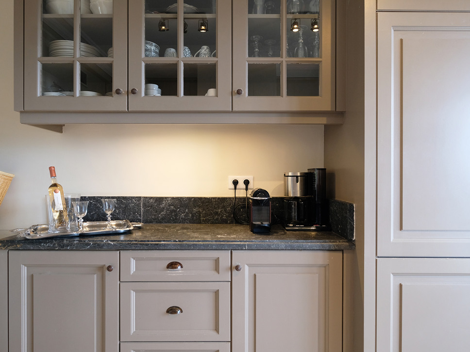 Op de begane grond bevindt zich de zeer comfortabel ingerichte en ruime living met openhaard. In het verlengde van de living is de eetkamer met grote eettafel. Naast de living bevindt zich een luxe open keuken, ruim en modern ingericht en voorzien van alle apparatuur, zoals o.a. 5-pitsgasfornuis, vaatwasser, grote koelkast. Zowel living, keuken als studiekamer bieden direct toegang tot het balkon op de middenverdieping. Naast de keuken bevindt zich op de begane grond ook een stijlvolle studiekamer met klassiek houten bureau. Ook is er een bijkeuken met wasmachine en droger. WiFi-Internet is aanwezig.