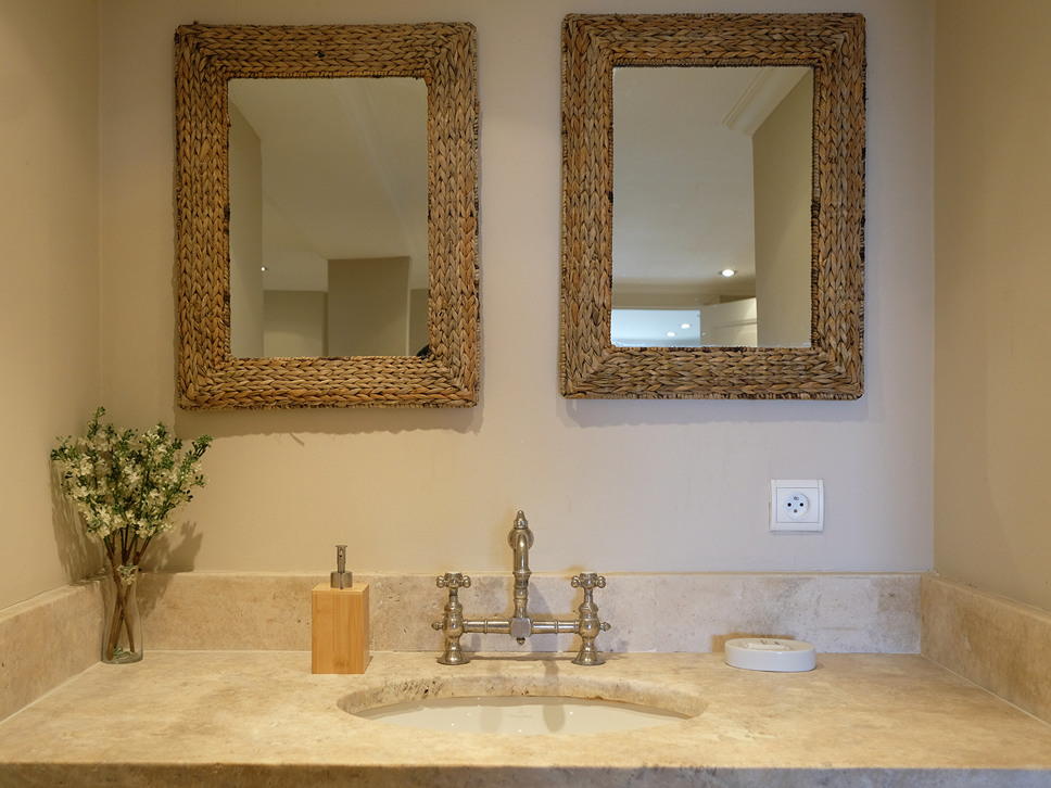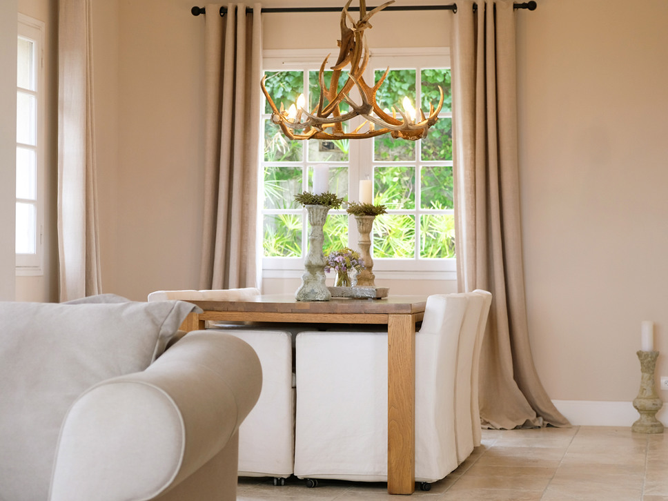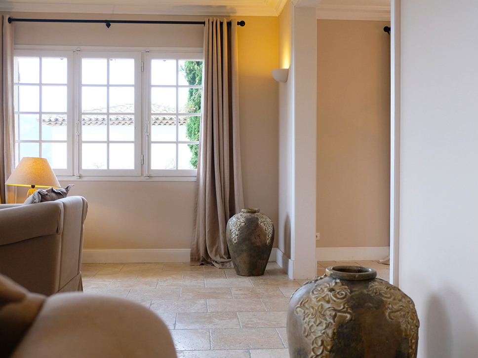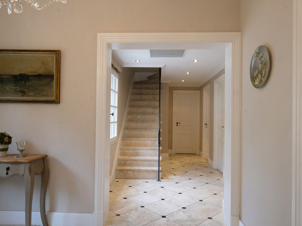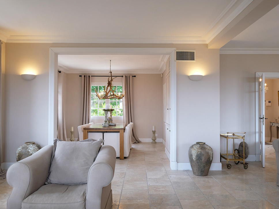 Luxe stoffering en het consequent doorgevoerde gebruik van aarde- en grijstinten alsook het gebruik van luxe materialen zoals Travertin-tegels, marmer in de badkamers en houten ornamenten geven deze villa een zeer exclusief karakter.
