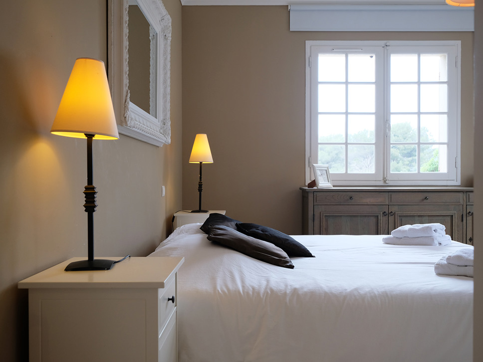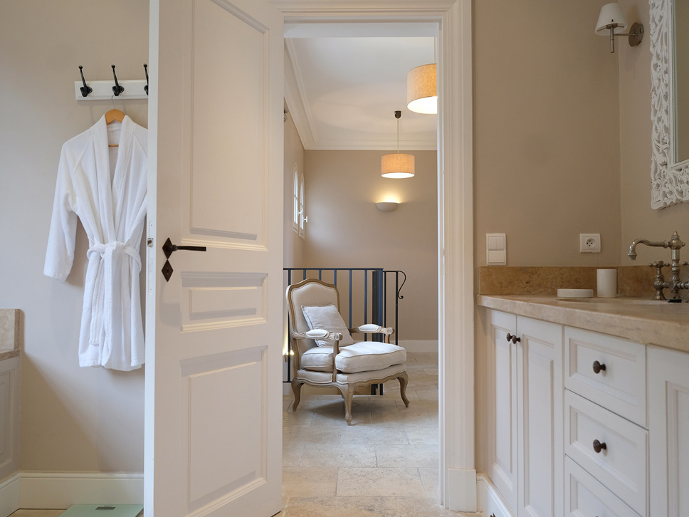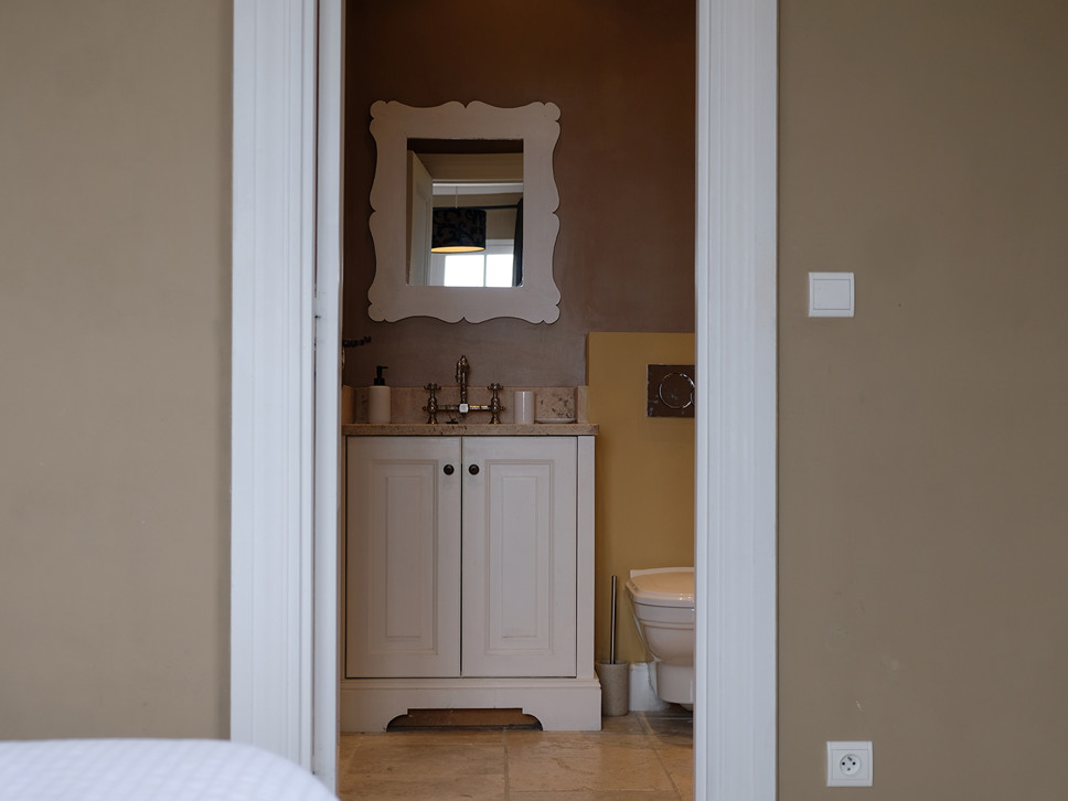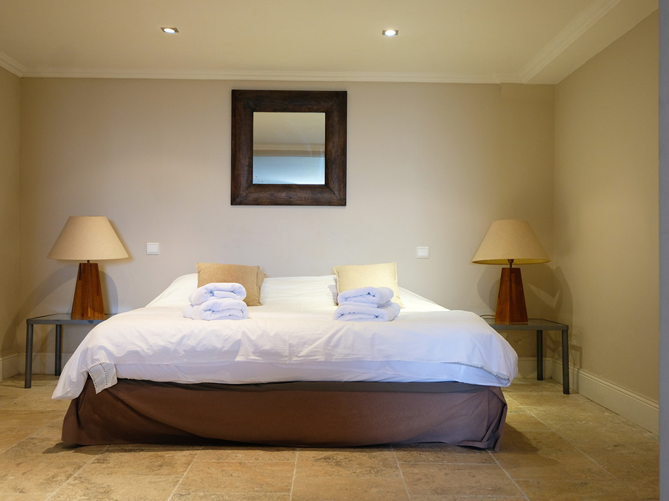 Slaapkamer 4, ook op de 2e verdieping, biedt een tweepersoonsbed en maakt gebruik van een royale badkamer (ligbad, dubbele wastafel en WC) op de gang, recht tegenover de slaapkamer. Voorzien van airconditioning