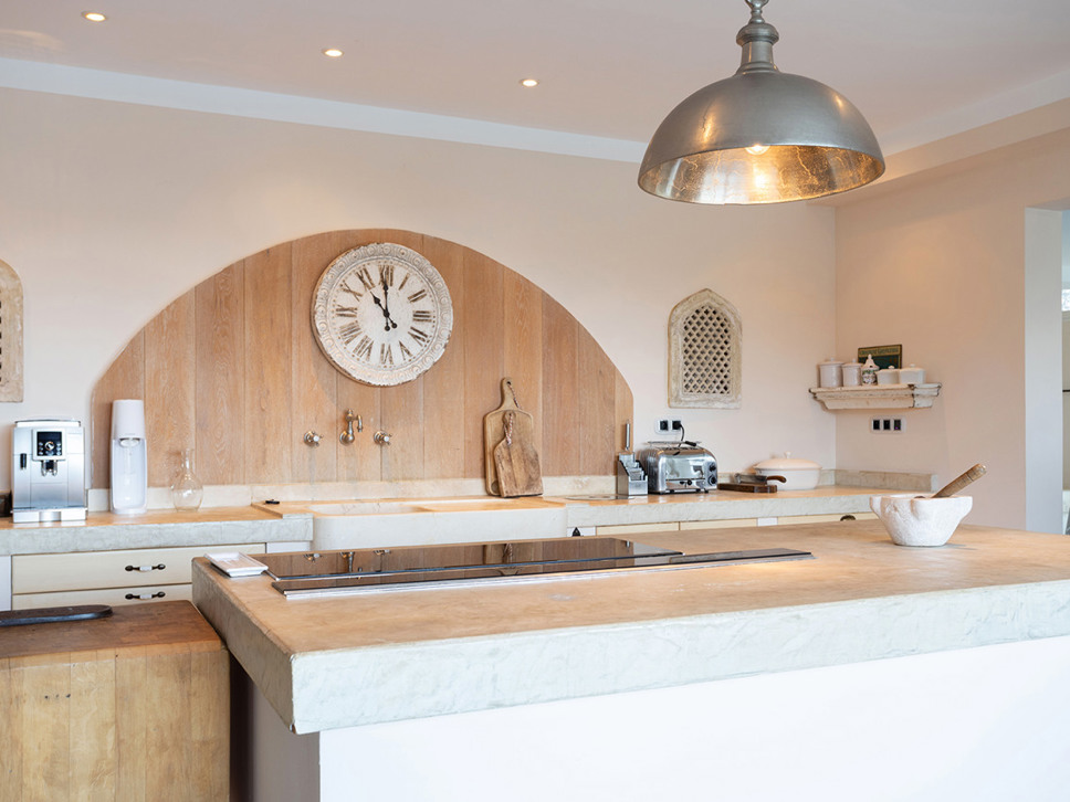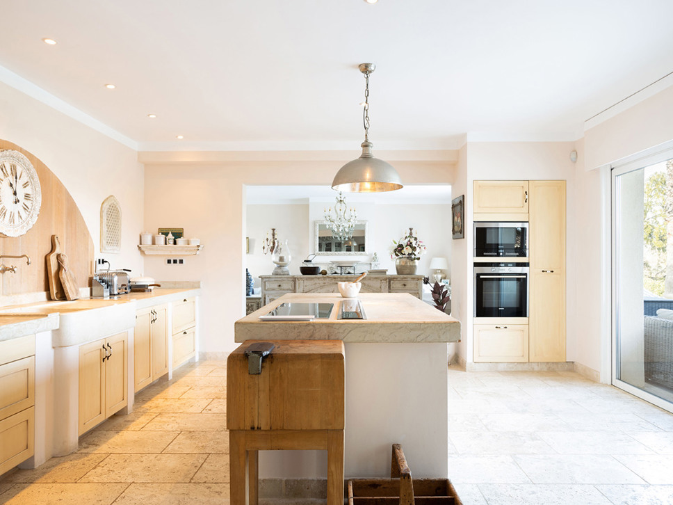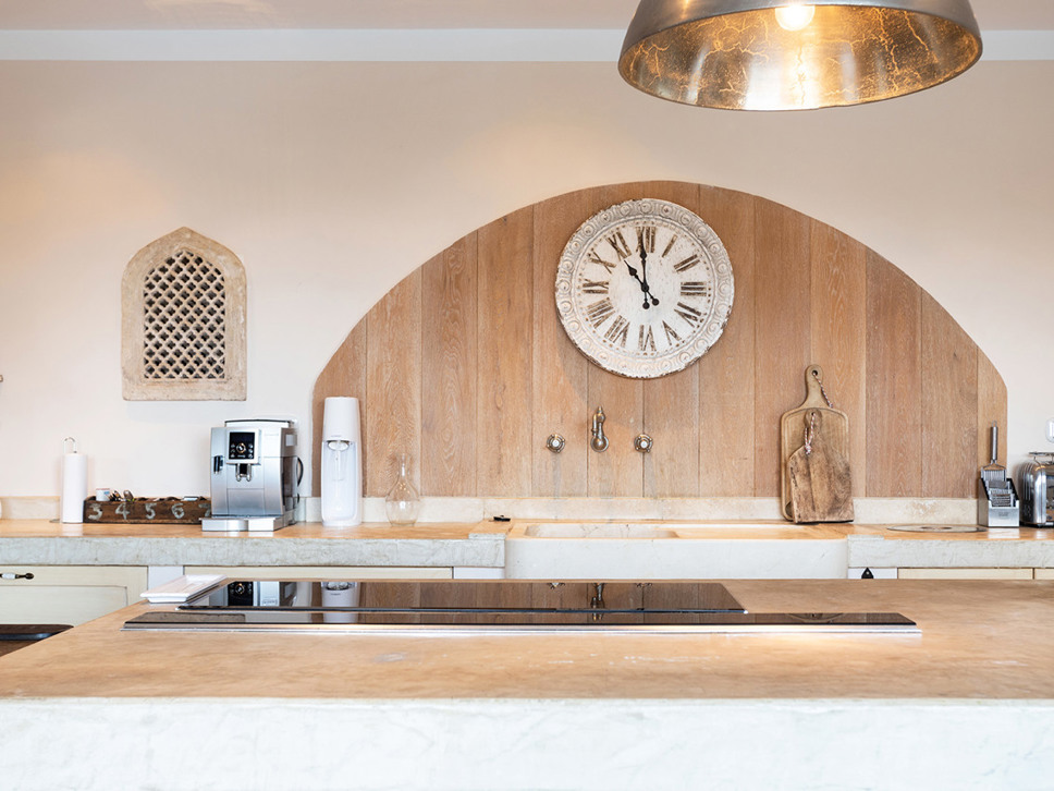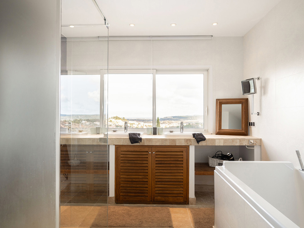 Er is een ruime living met over de gehele zijde een uitzicht over het terras en het zwembad richting de Middellandse Zee. De living beschikt u over een royale zithoek en een ruime woonkeuken met eetgedeelte. Zowel de living als de keuken bieden toegang via de grote schuifdeuren tot het overdekte gedeelte van het terras. De keuken zelf beschikt over alle voorzieningen, 4 kookplaten, magnetron, oven/grill, koelvrieskast, afwasmachine, broodrooster, waterkoker en koffiezetapparaat.