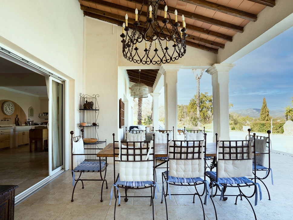 Vanuit de gehele begane grond loopt u zo het terras aan de voorzijde van de villa op. Het terras is gedeeltelijk overdekt en biedt goede schaduw aan het einde van de middag. Er staat een comfy loungeset dus een mooie plek om heerlijk te genieten van een goed boek en een glas koude rosé.