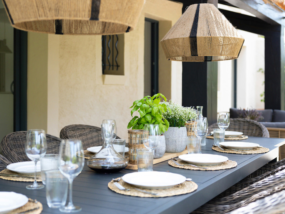 Het hoge niveau qua stijl en comfort van het interieur wordt moeiteloos buiten voortgezet. Het fraai ingerichte terras is voorzien van diverse zitjes; een XL-eettafel en luxe loungebanken met voldoende heerlijke kussens.