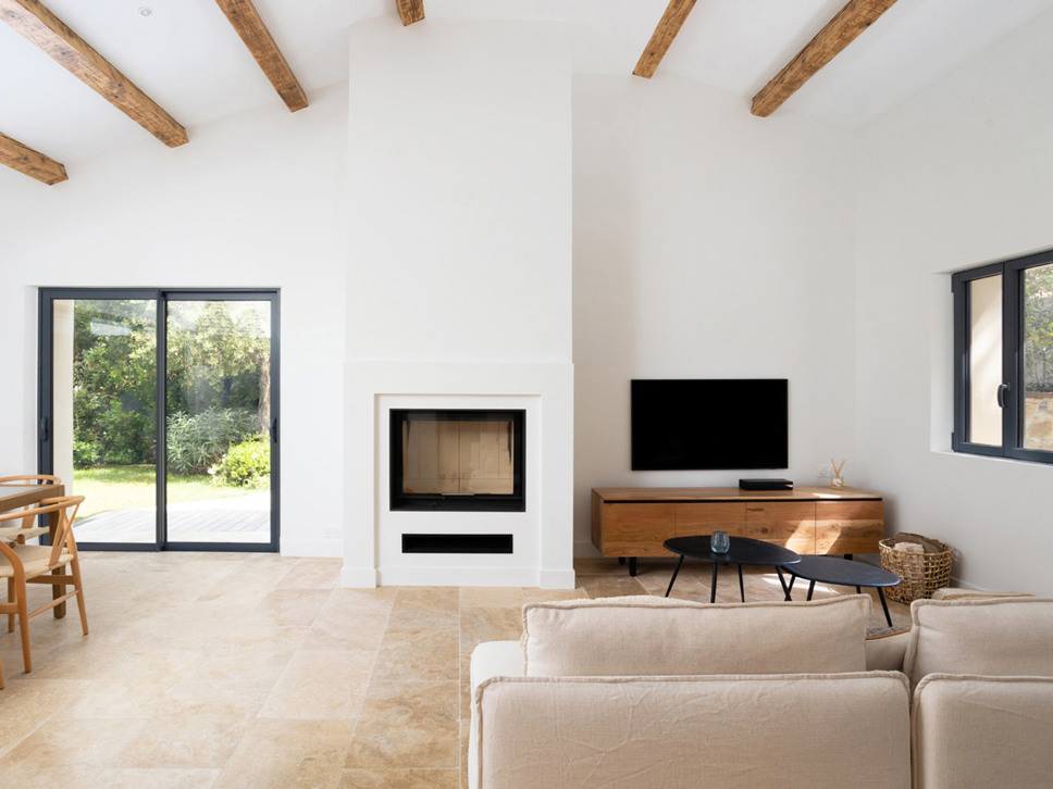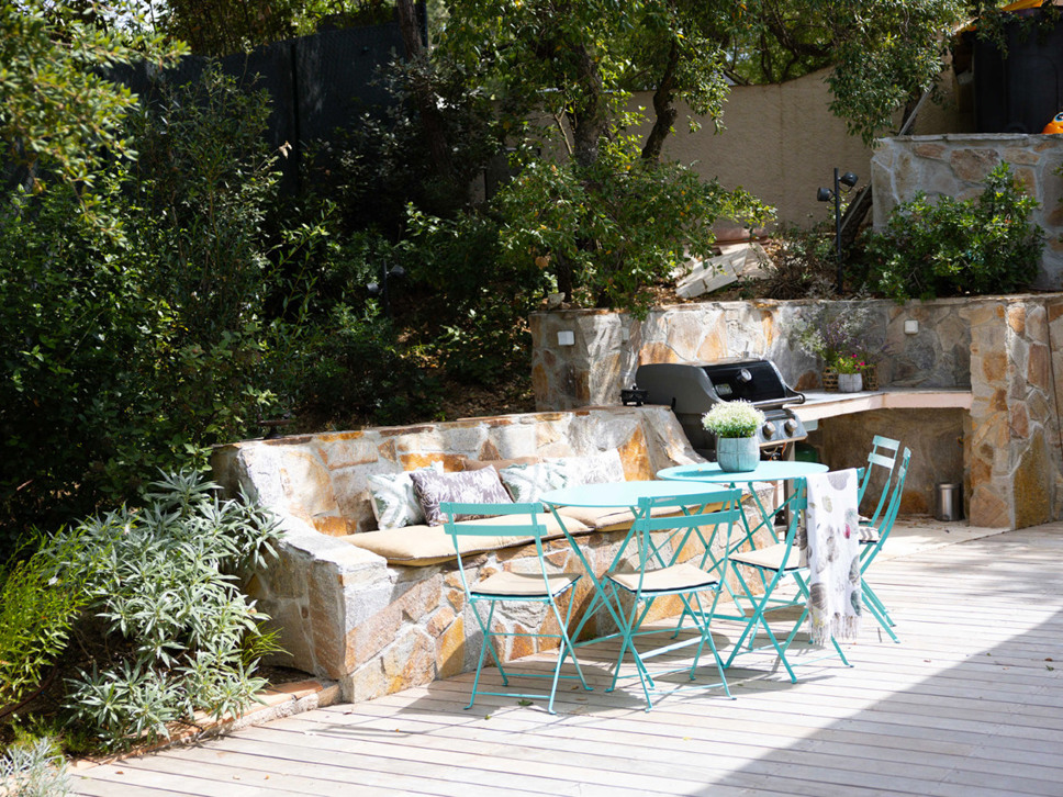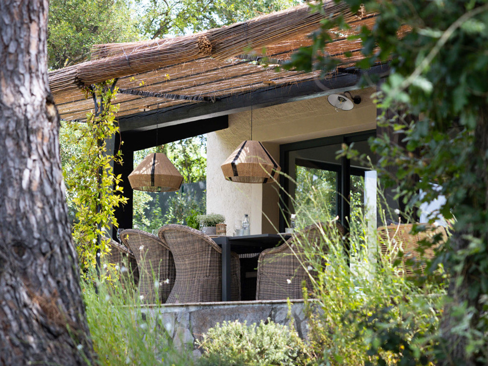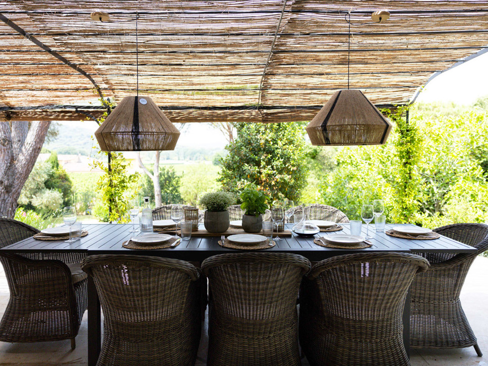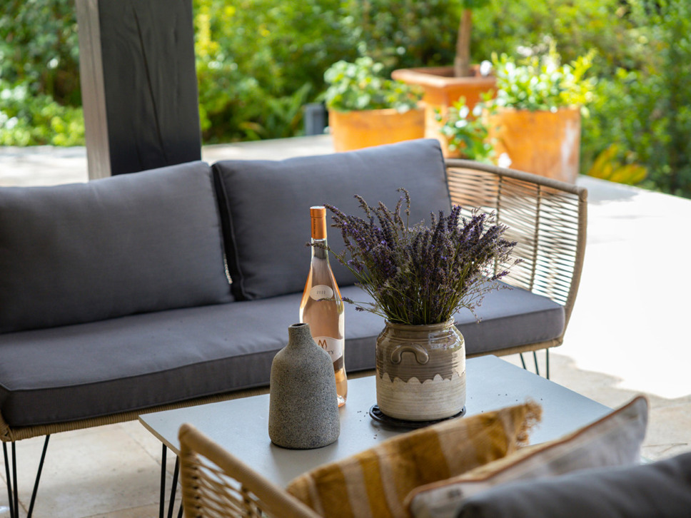 Als u niet geniet van het zwembad ligt u of op de zonnebedjes bij het zwembad of verblijft u op het deels overdekte terras. Vanaf het ontbijt tot en met de borrel voor het slapen gaan, wat een heerlijke plek is dit terras. Vanaf hier kijkt u uit op het mooie grote zwembad met daarachter de wijngaarden van Bertaud Belieu. Tuinverlichting is voldoende aanwezig. Een openhaard is aanwezig in de living maar deze heeft u in de zomer niet nodig.