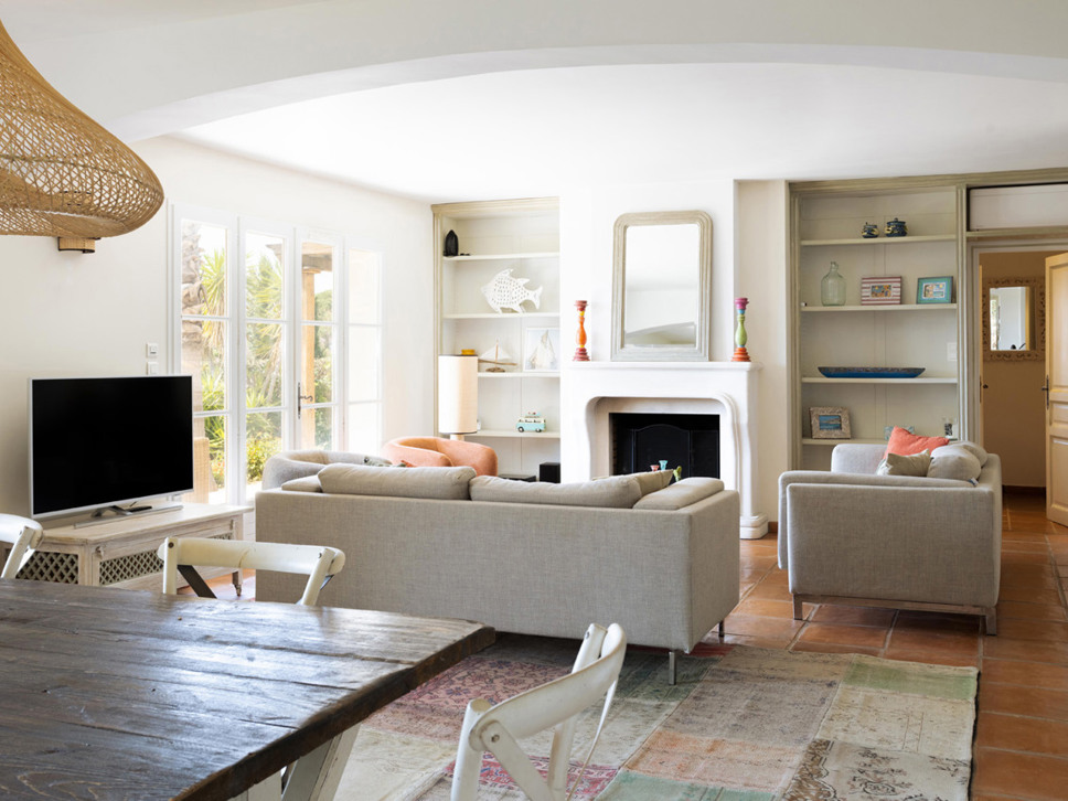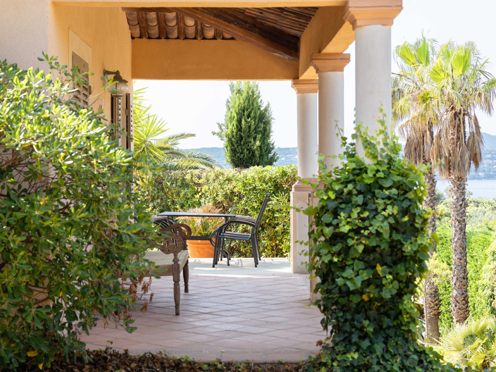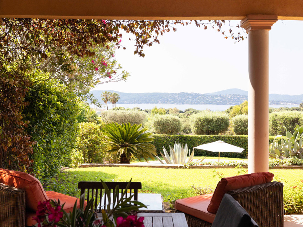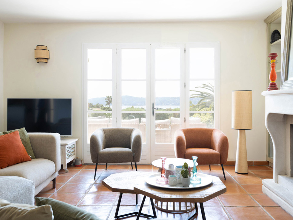 Vanuit de living heeft u een prachtig uitzicht op de royale tuin, het zwembad en de Golf van Saint-Tropez. Zowel de keuken als de woonkamer geven toegang tot het overdekte terras aan de tuinzijde van de villa.