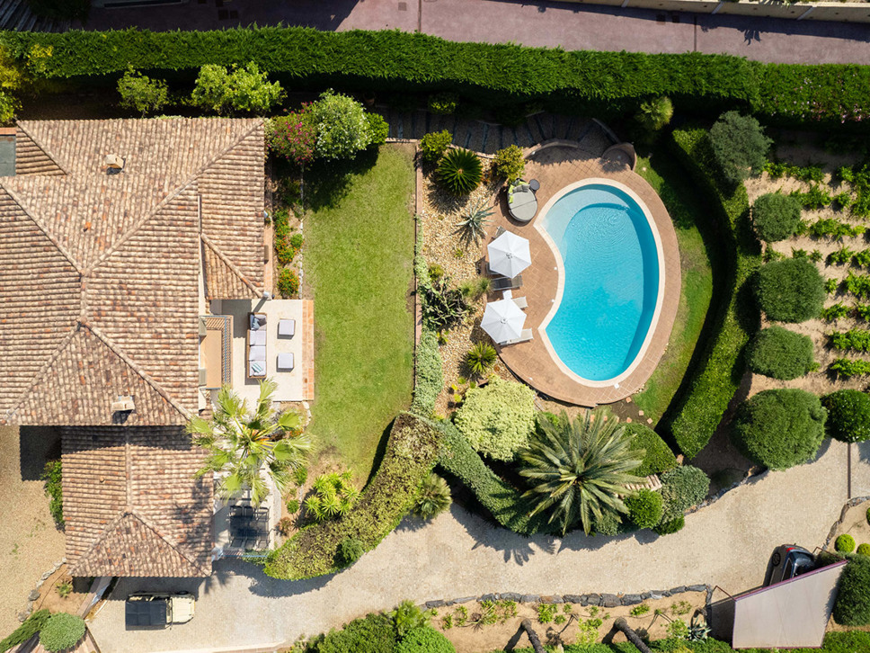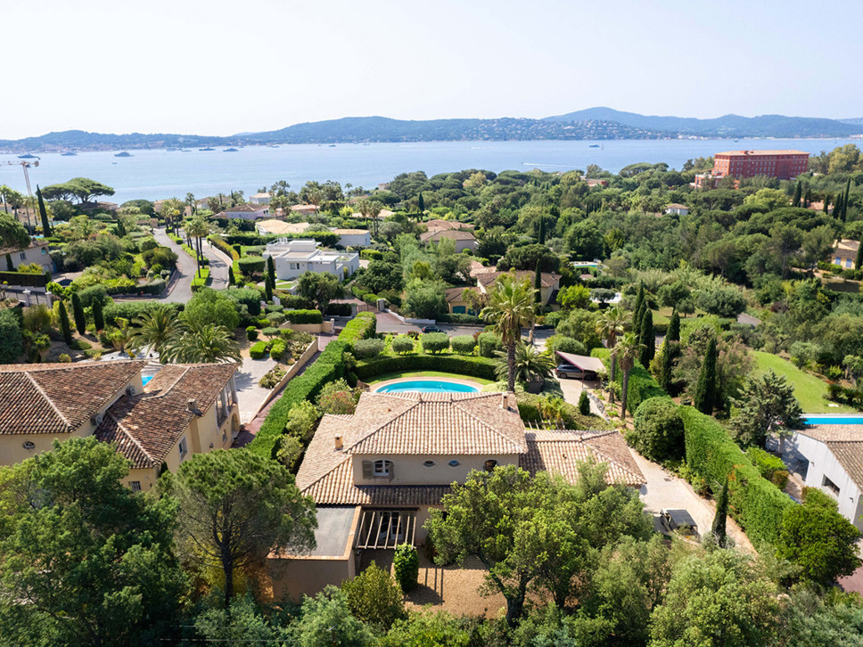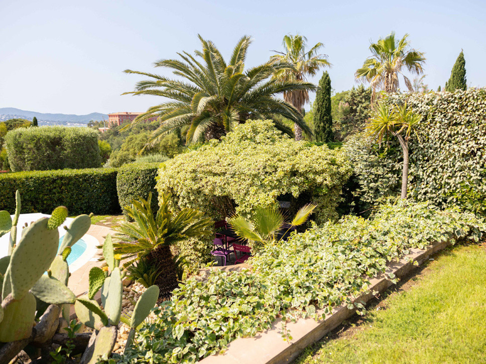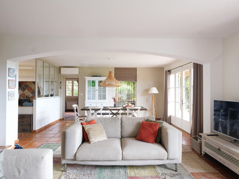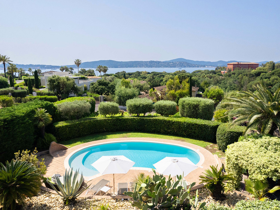 Vanuit de living heeft u een prachtig uitzicht op de royale tuin, het zwembad en de Golf van Saint-Tropez. Zowel de keuken als de woonkamer geven toegang tot het overdekte terras aan de tuinzijde van de villa.