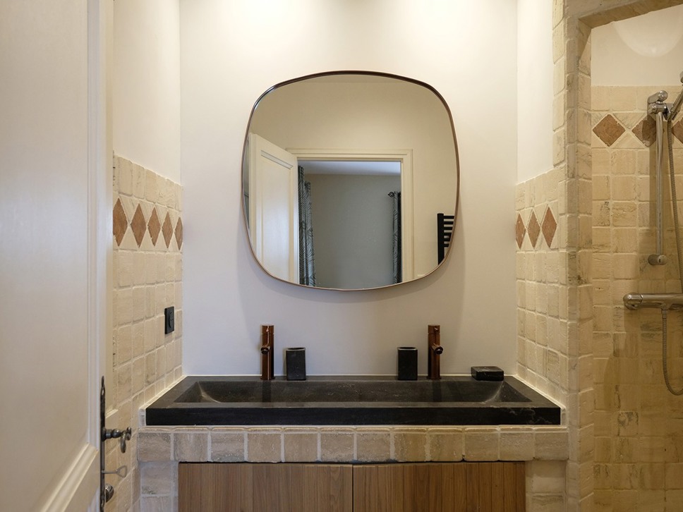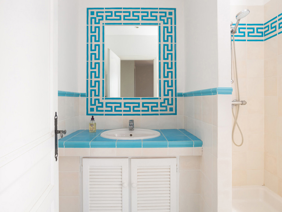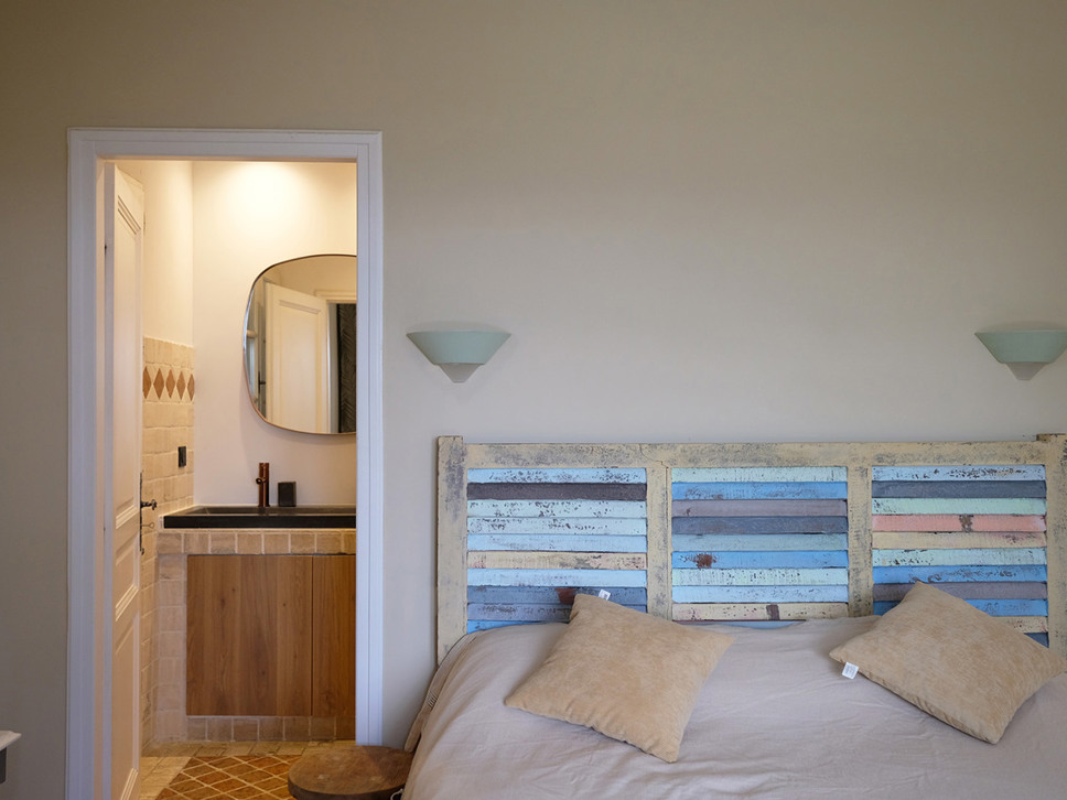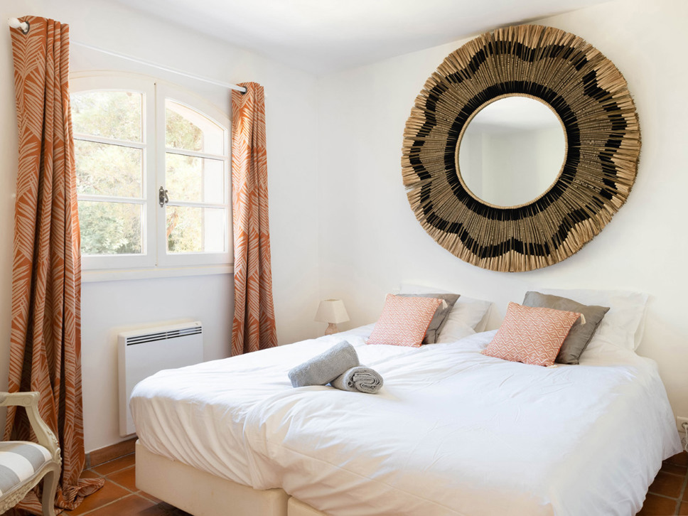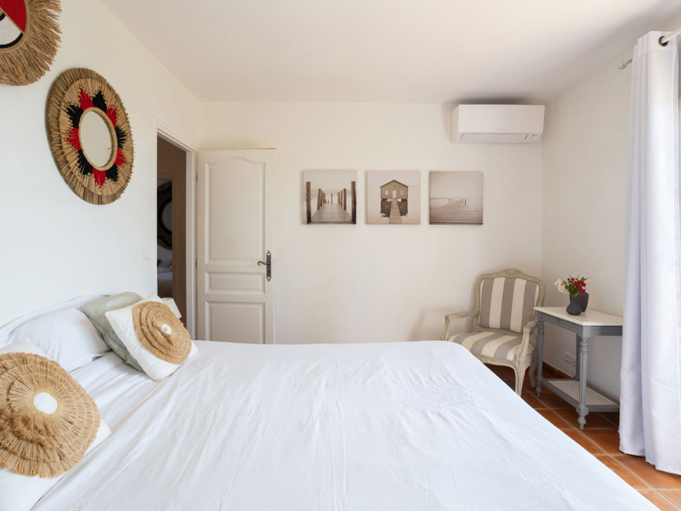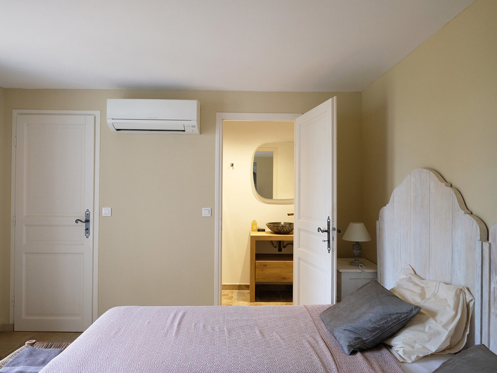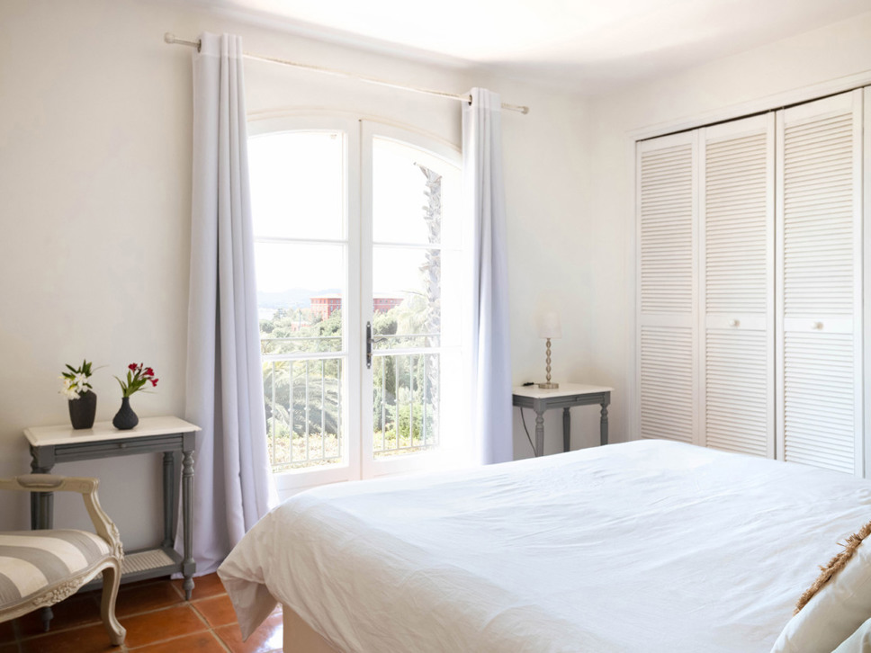 Slaapkamer 3 ligt op de eerste verdieping en biedt een tweepersoonsbed (180x200) met een en-suite badkamer met wastafel en douche. Dankzij het charmante balkon met een adembenemend uitzicht over Saint-Tropez wordt dit gemakshalve de ouderslaapkamer genoemd. Deze kamer is voorzien van airconditioning.