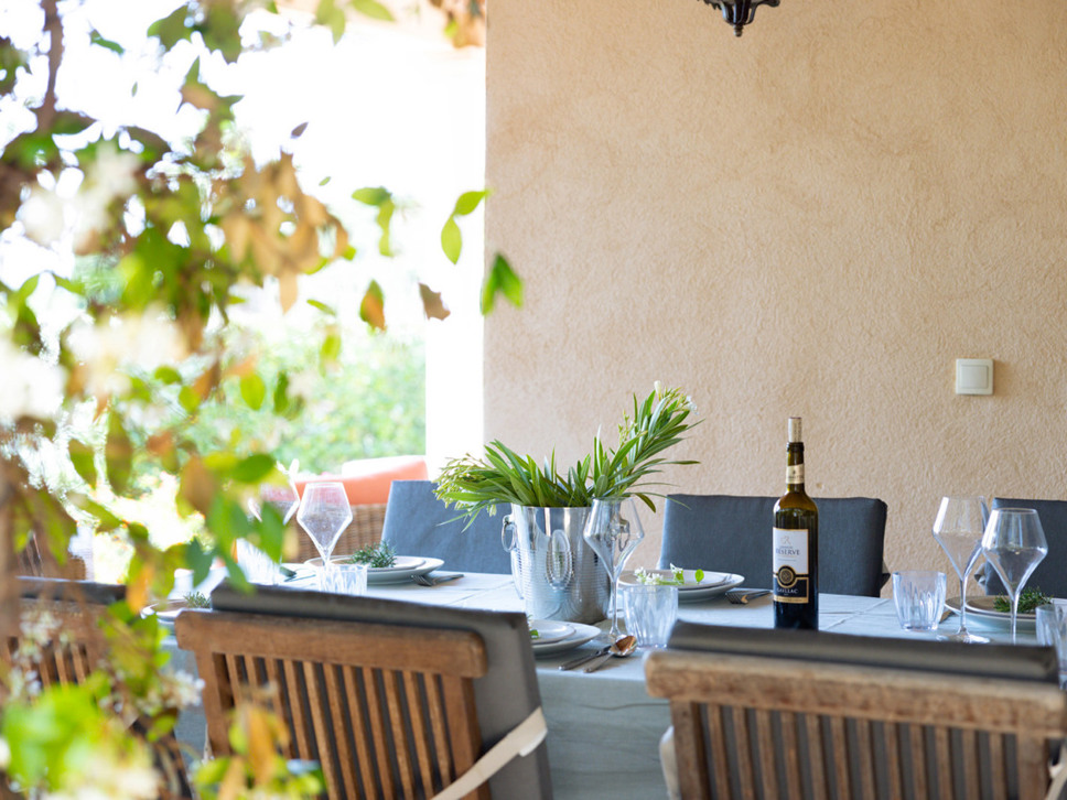 Openslaande deuren verbinden de living met het royale terras. In het midden op het terras staat een comfy loungeset. Onder de overkapping bij de vaste BBQ staat een grote eettafel met 10 stoelen. Ideaal voor lunch of diner in de schaduw.