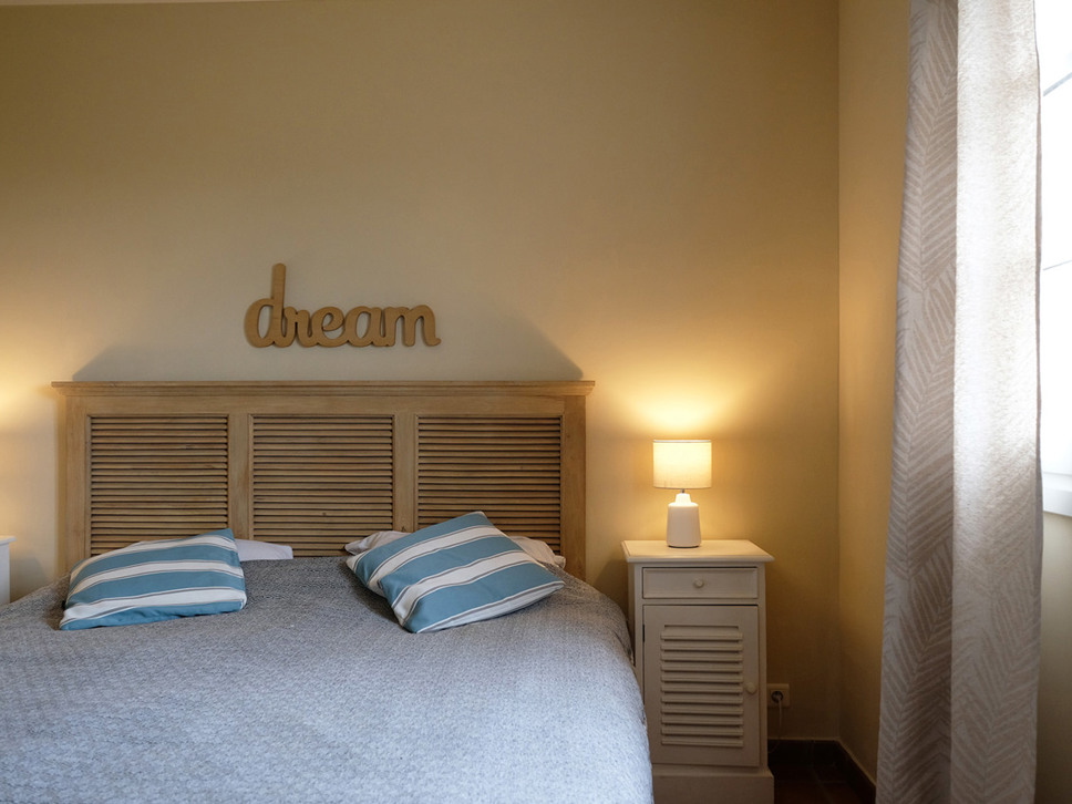 Slaapkamer 1, bevindt zich op de begane grond en is ingericht met een tweepersoonsbed (160x200) en een en-suite badkamer met wastafel, douche en separaat toilet. Deze kamer is voorzien van airconditioning.