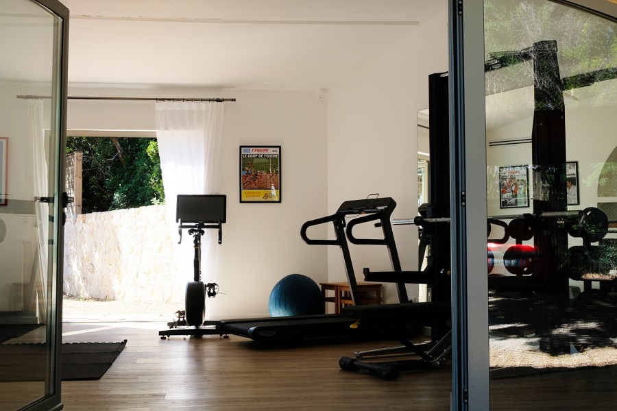 Privé gym, de villa beschikt over een royale gym is uitgerust met moderne Technogym-apparatuur en heeft een eigen badkamer. De gym is bereikbaar via een trap vanuit de living.
