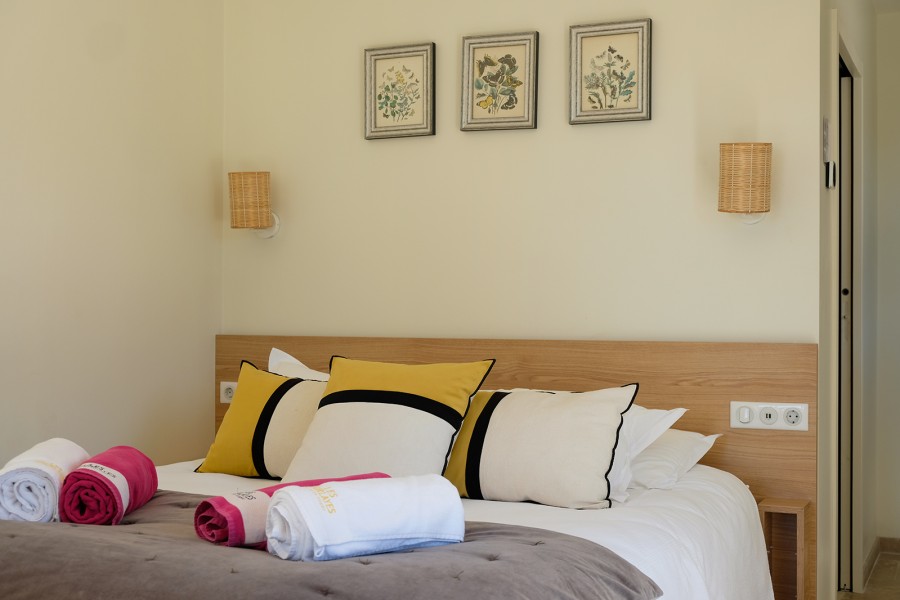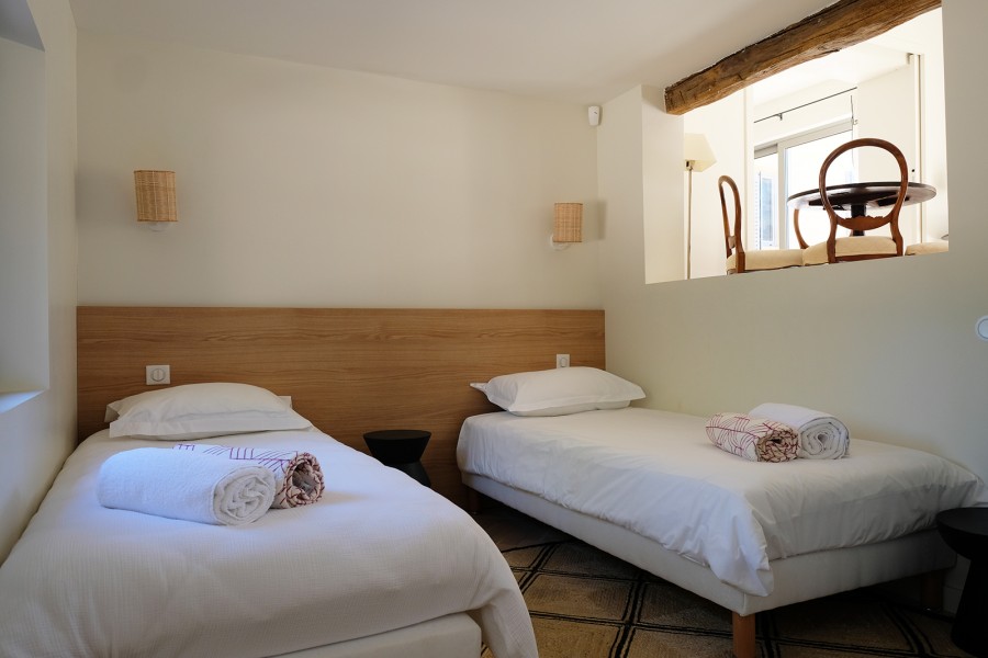 Slaapkamer 6 en 7, (begane grond) een familieappartement met twee slaapkamers en twee badkamers in duplex (één boven en één beneden) met een fraaie zithoek als verbindend element. Dit appartement is zowel vanuit de villa als via een eigen entree van buitenaf toegankelijk. Dit maakt het bijzonder geschikt voor ouders met jongere kinderen.