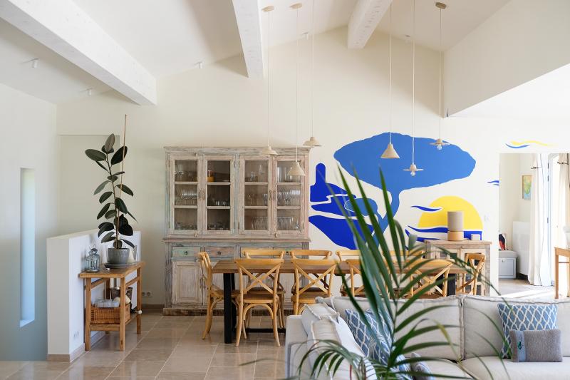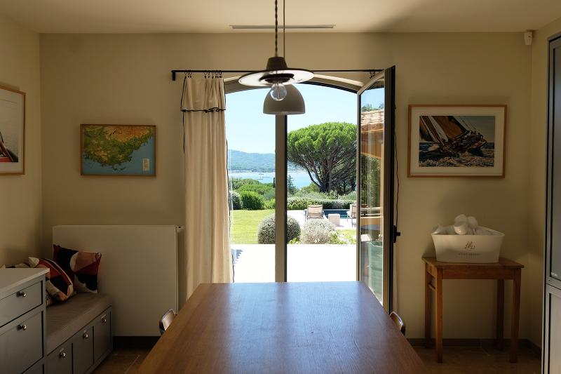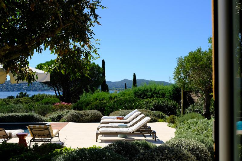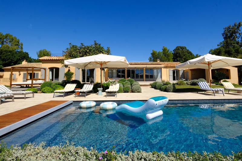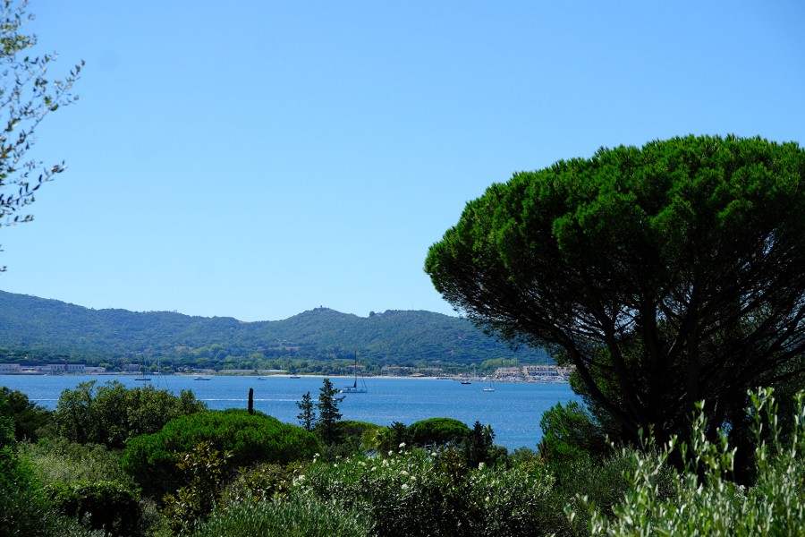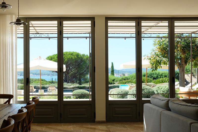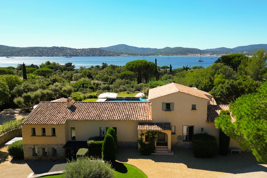 Deze exclusieve villa heeft een royaal woonoppervlak van 400 m². Grote glaspartijen zorgen voor een breed uitzicht over de tuin met zwembad en richting de Golf van Saint-Tropez.