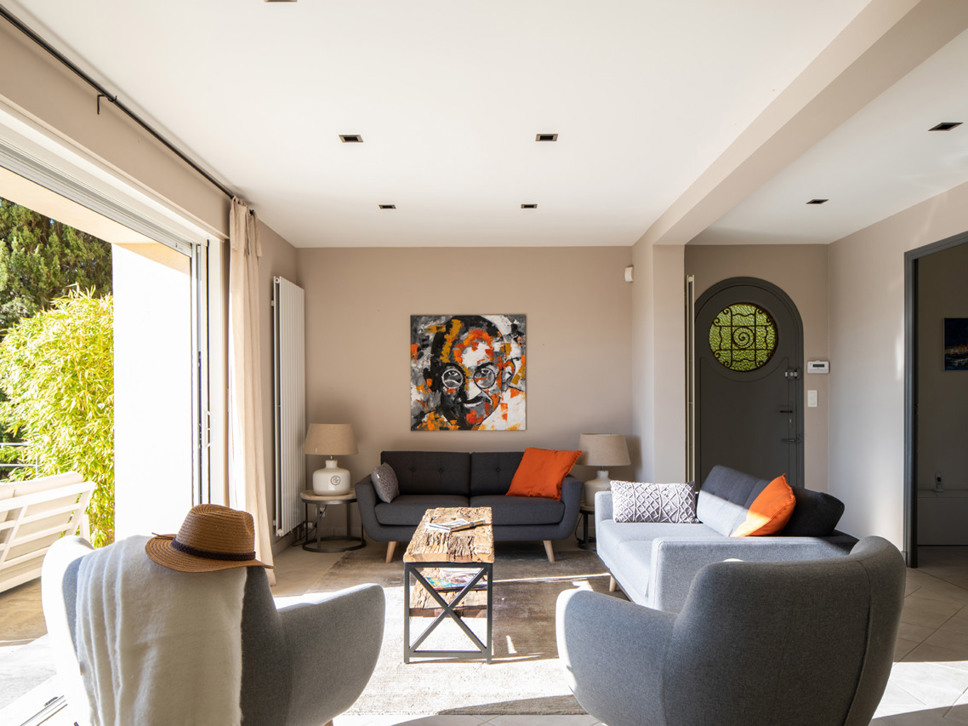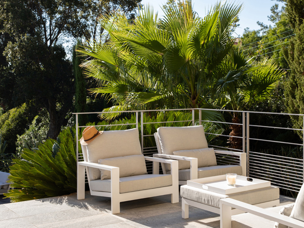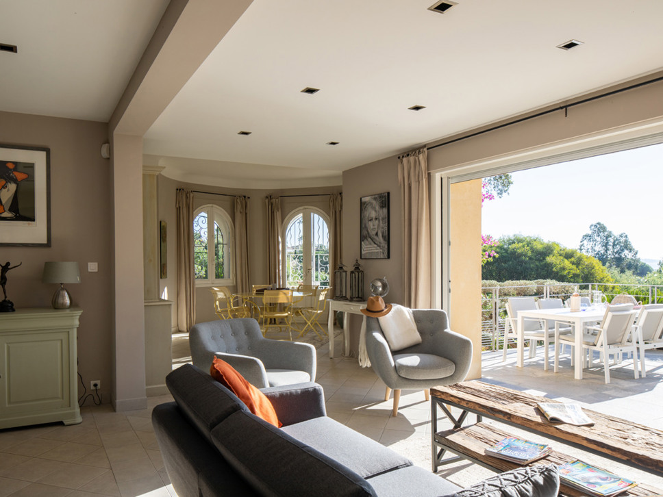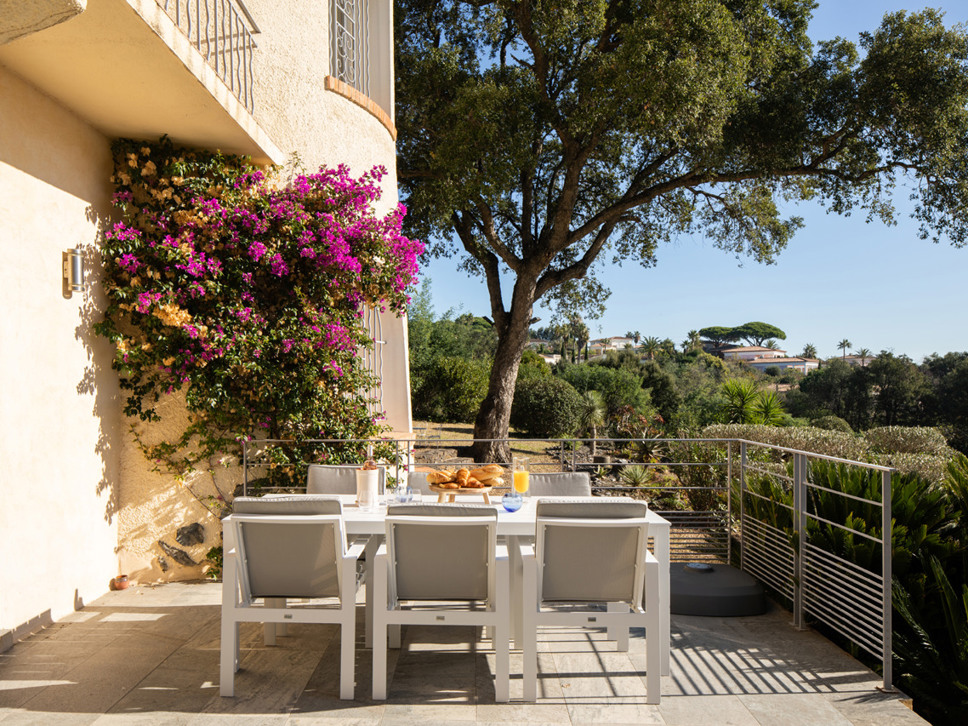 Vanuit de living loopt u zo naar het mooie natuurstenen terras voorzien van mooi buitenmeubilair; een loungehoek en eettafel voor 6 personen. Vanwaar u kunt genieten van een fraai zicht richting Saint Tropez. Door het volledig openen van de tuindeuren vanuit de living geniet u ook binnen van buiten. De grote Weber gas BBQ is bijna een kleine buitenkeuken te noemen, erg leuk.