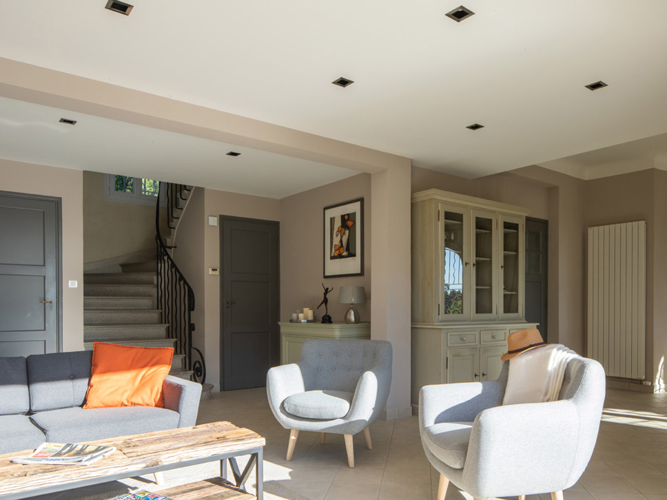 De sfeervolle living van de villa bevindt zich op de begane grond en is stijlvol en gezellig ingericht. Zo is de living voorzien van een zithoek bestaande uit moderne comfy zitbanken en fauteuils, TV, een ronde eettafel met 6 stoelen. Erg fraai vinden we de volledig in de muren van de living te "verstoppen" glazen pui waardoor de living "overloopt" in het terras buiten.