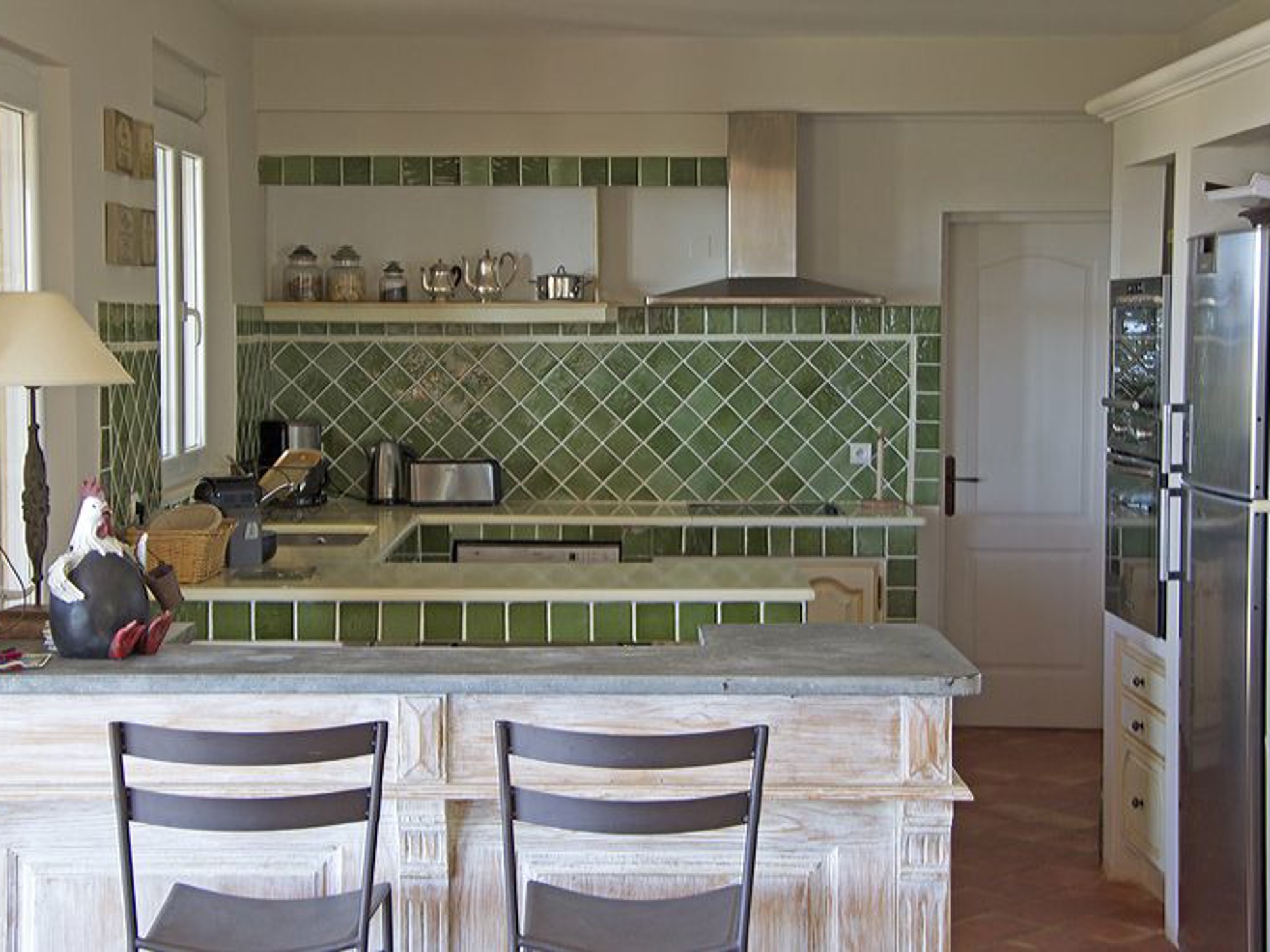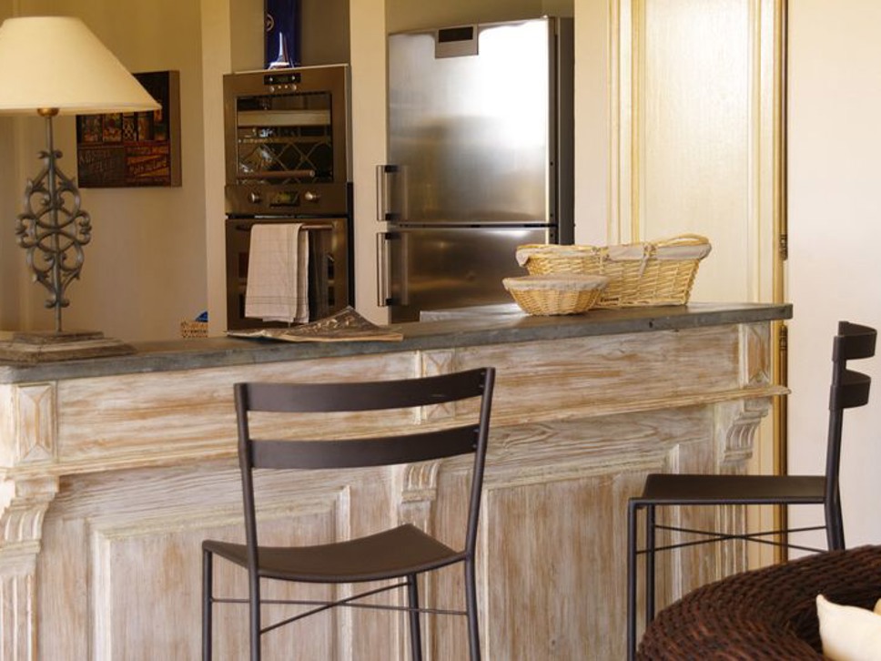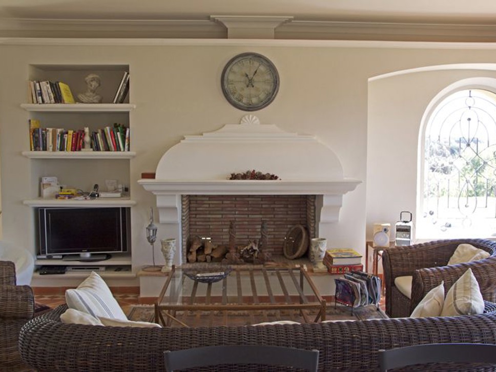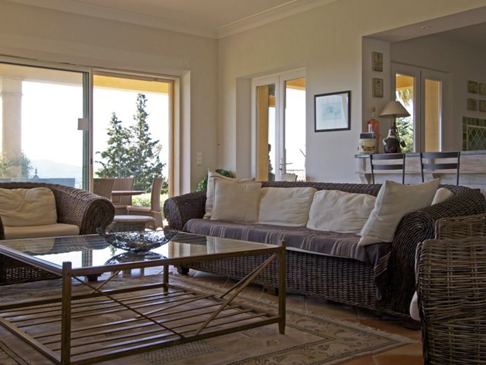 De living is ruim en licht. De villa is sfeervol ingericht met een combinatie van rotan, Provençaalse tegels, teakhout en frisse witte muren. Grote glazen schuifdeuren geven toegang tot het overdekte terras met prachtig uitzicht richting Saint-Tropez en de Middellandse Zee. De open keuken is uitgerust met diverse elektrische apparaten. Er is WiFi aanwezig.