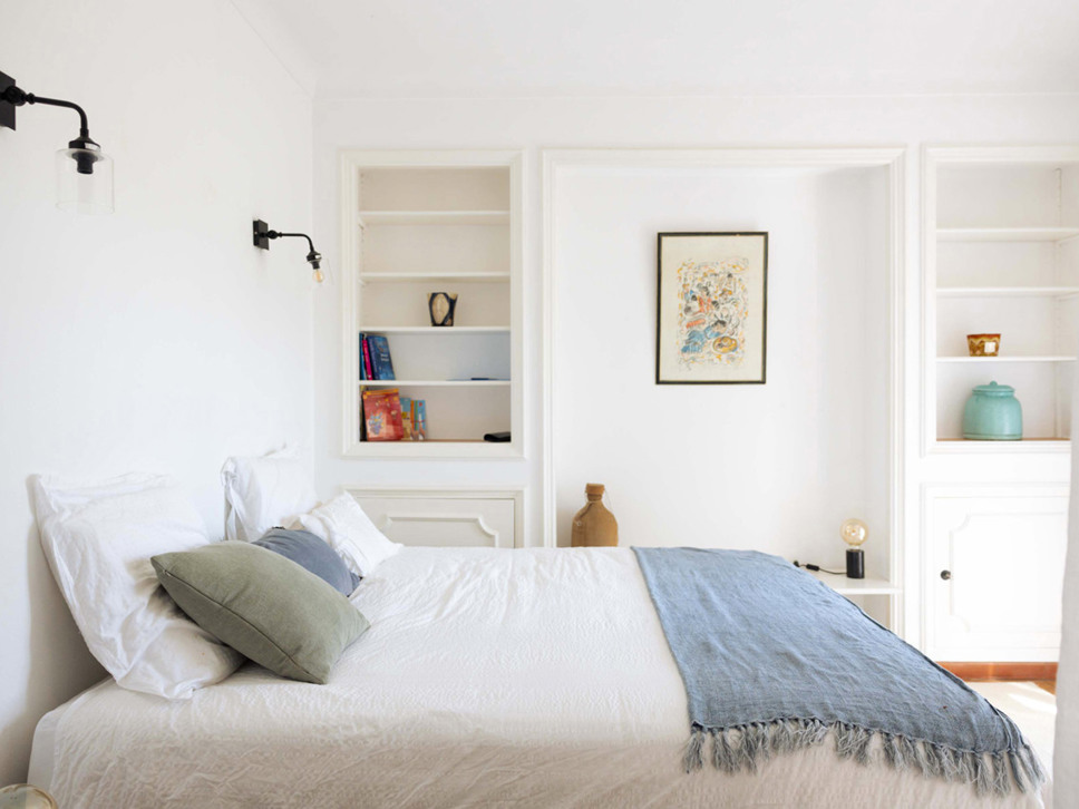 Slaapkamer 4 bevindt zich in het verlengde van de woonkamer en wordt afgescheiden door een kamerscherm. Hoewel deze ruimte minder privacy biedt, is dit een charmante oplossing als kinderkamer of logeerkamer. Het beschikt over een tweepersoonsbed (160x200 cm) en maakt gebruik van de aangrenzende badkamer op de gang, voorzien van douche, wastafel en toilet.