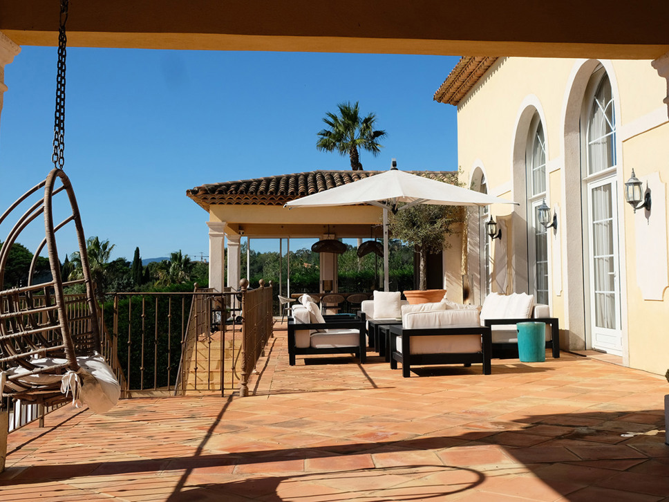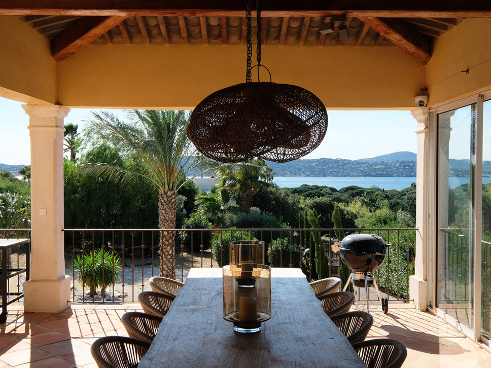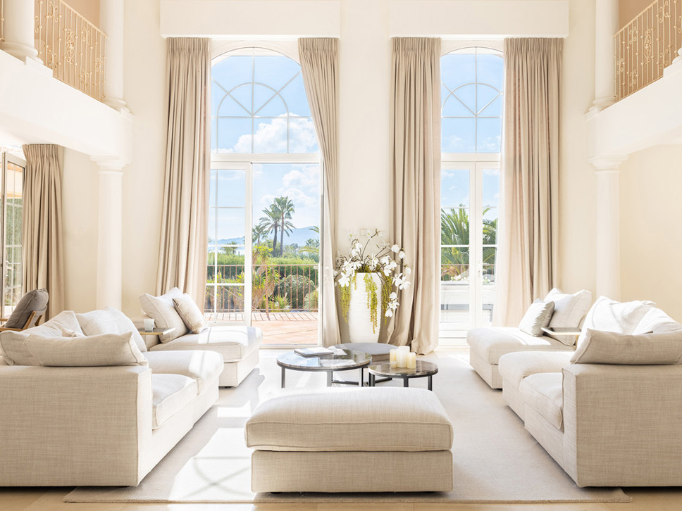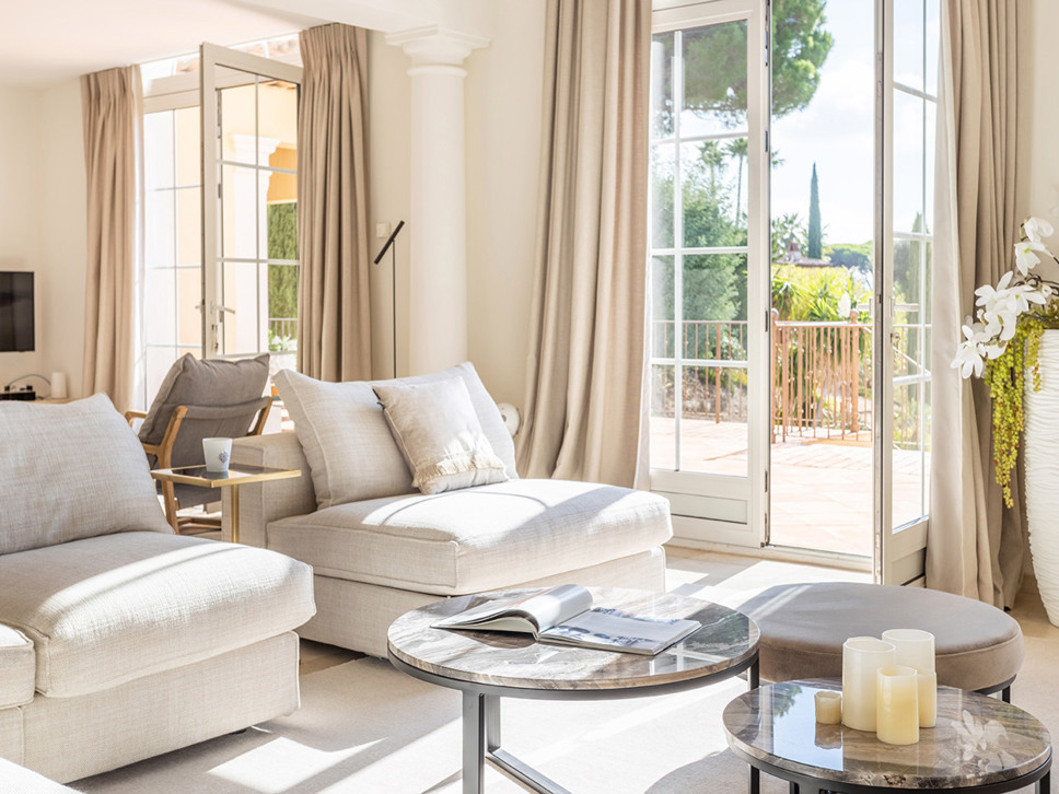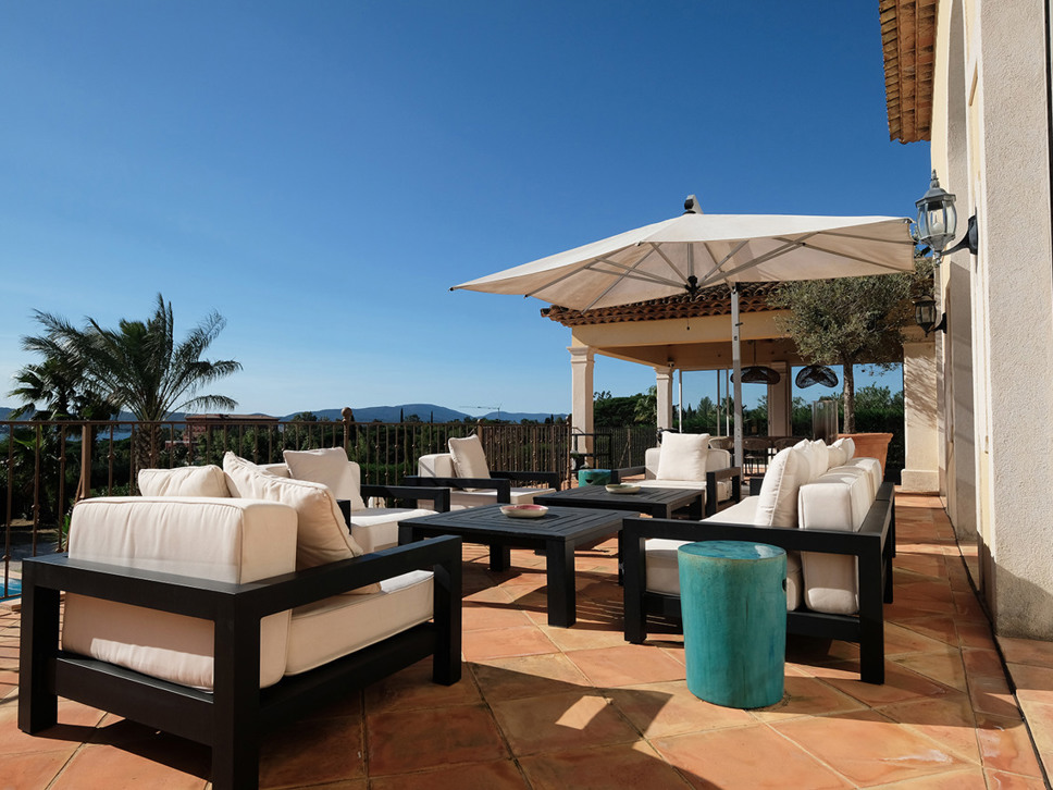 Er is een royale living met een bijzonder hoog plafond en dito raampartijen welke uitzicht bieden over de Golf de Saint Tropez en de Middellandse zee. De gehele villa is voorzien van airconditioning.