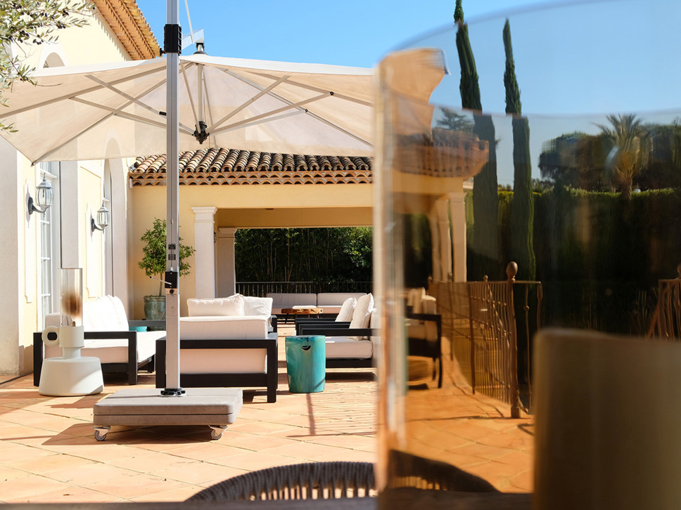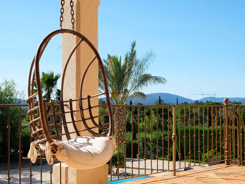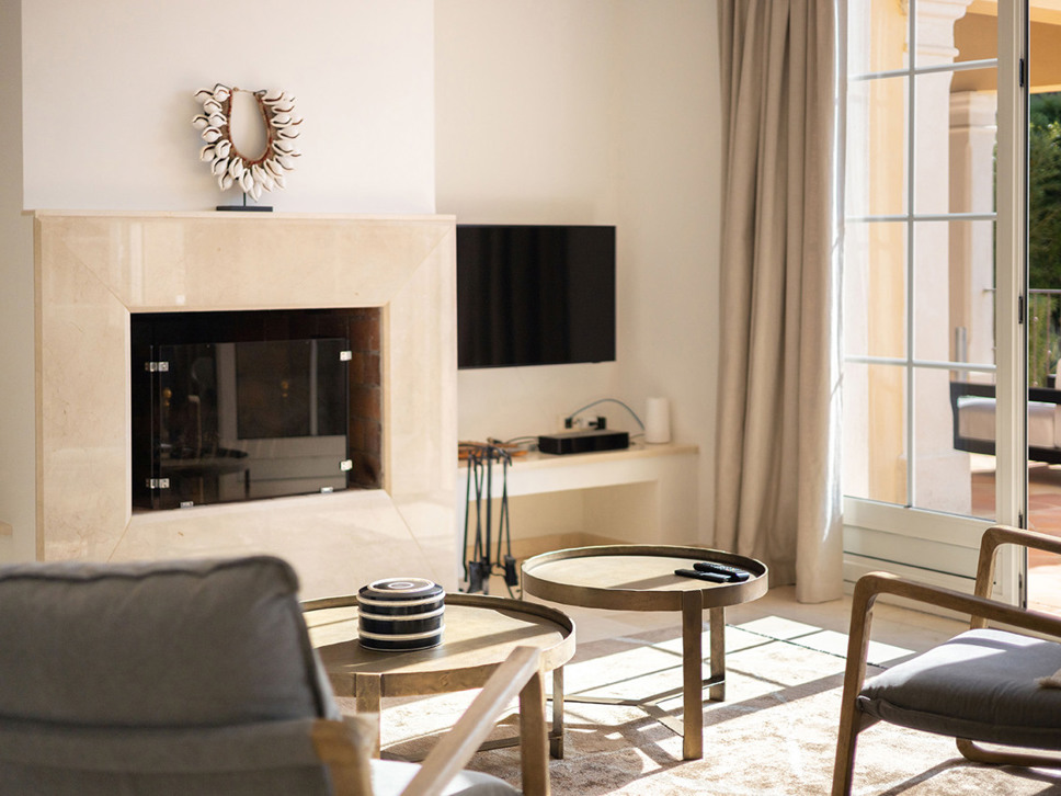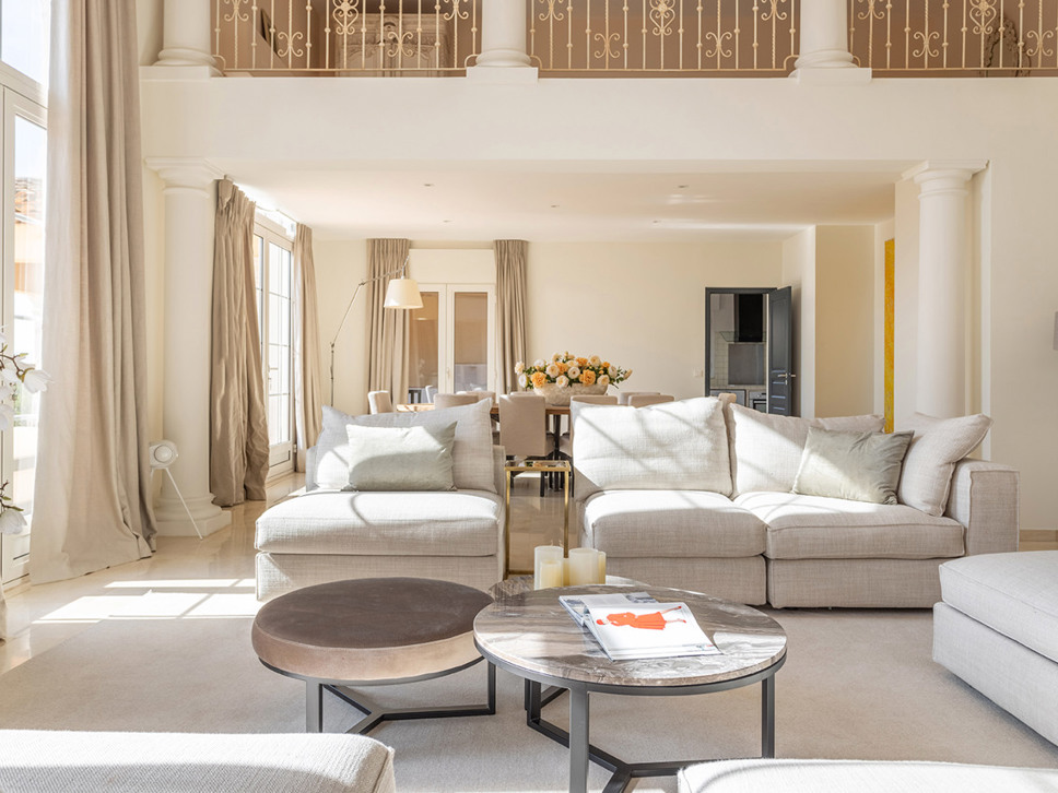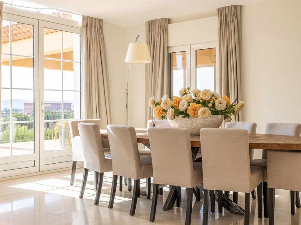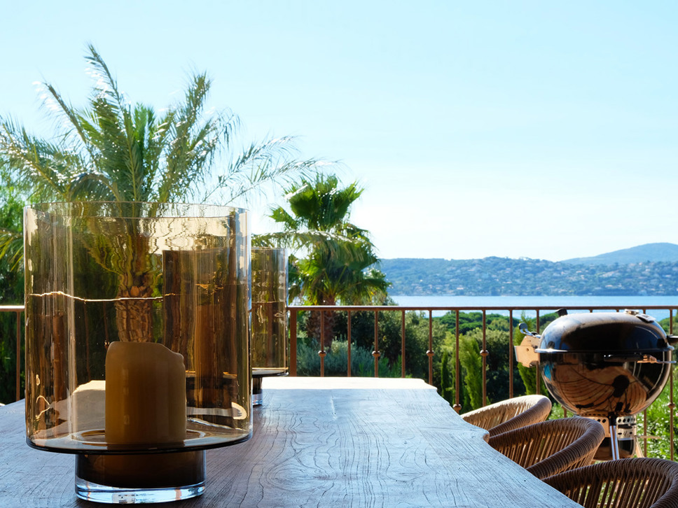 Er is een royale living met een bijzonder hoog plafond en dito raampartijen welke uitzicht bieden over de Golf de Saint Tropez en de Middellandse zee. De gehele villa is voorzien van airconditioning.