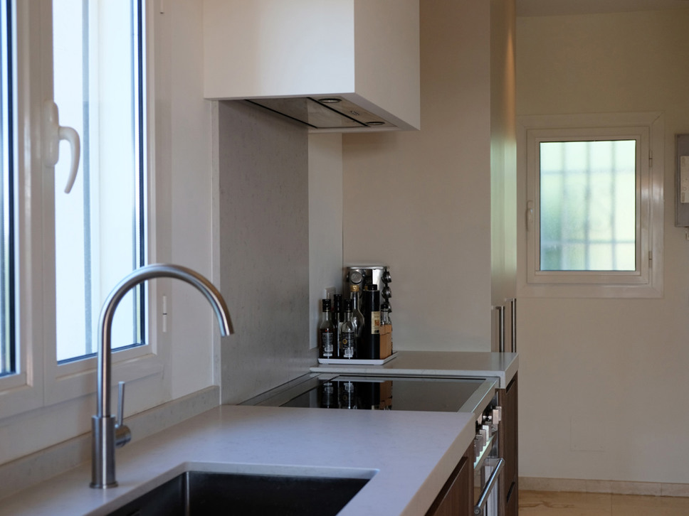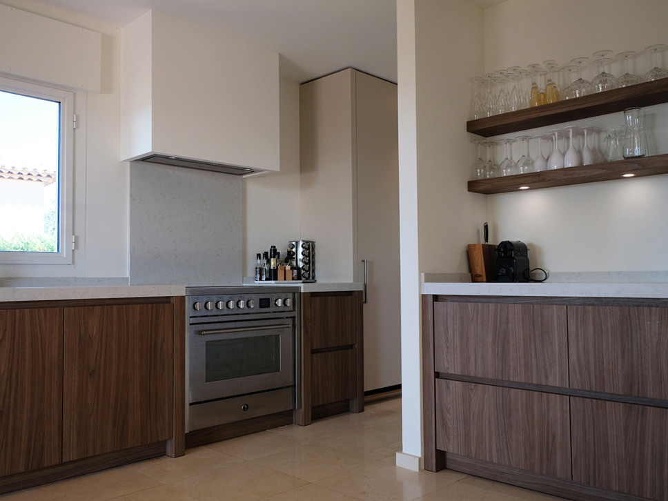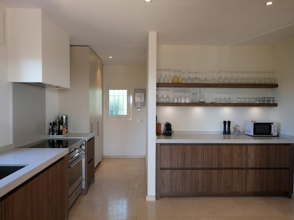 In de living beschikt u over 2 luxe en moderne zithoeken. In het verlengde van de living bevindt zich de ruime open keuken. De traditionele keuken biedt toegang via de grote schuifdeuren tot het overdekte gedeelte van het terras. De keuken beschikt over alle voorzieningen, 4 kookplaten, magnetron, oven/grill, koelvrieskast, afwasmachine, broodrooster, waterkoker en koffiezetapparaat.