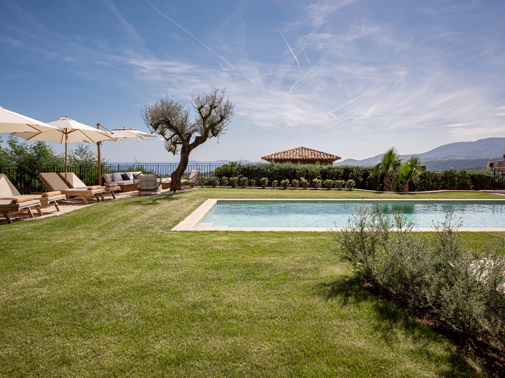 Op de bovenverdieping vindt u: Slaapkamer 3 is een 2e ouderslaapkamer met een tweepersoonsbed (180x200) en de en-suite badkamer is voorzien van een luxe inloopdouche, wastafel en W.C. Erg leuk vinden we het balkon vanwaar een prachtig zicht over de wijnvelden en de Middellandse Zee. Op slaapkamer 4 staat een tweepersoonsbed (180x200) en de badkamer is en-suite met wastafel en luxe inloopdouche.Deze villa beschikt over een goed onderhouden tuin voorzien van diverse terrassen - waarvan 1 overdekt - en luxe buitenmeubilair. Het uitzicht is op de Middellandse Zee. U geniet hier dan ook volop van het buitenleven aan de Côte d’Azur. De villa is volledig op het zuiden georiënteerd en geniet derhalve van een uistekende zonligging met 180 graden zeezicht en over de wijngaarden.
