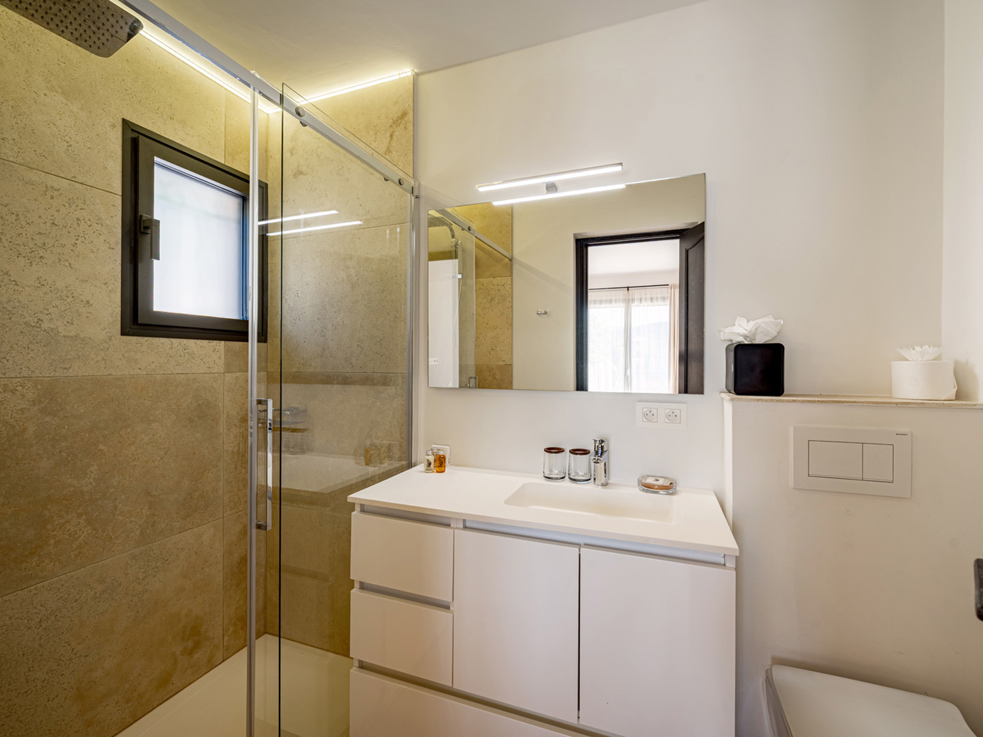 De villa beschikt over vier comfortabele slaapkamers, elk met een eigen luxe en-suite badkamer en royale inbouwkasten. In alle slaapkamers is airconditioning aanwezig.Op de benedenverdieping bevinden zich twee slaapkamers: Slaapkamer 1 is een ouderslaapkamer en deze biedt een tweepersoonsbed (180x200) en een luxe en-suite badkamer voorzien van wastafel, W.C. en ligbad met douche. Deze slaapkamer biedt een eigen terras met een leuk zitje. Slaapkamer 2 ook met tweepersoonsbed (180x200) en en-suite badkamer met wastafel, W.C. en luxe inloopdouche.