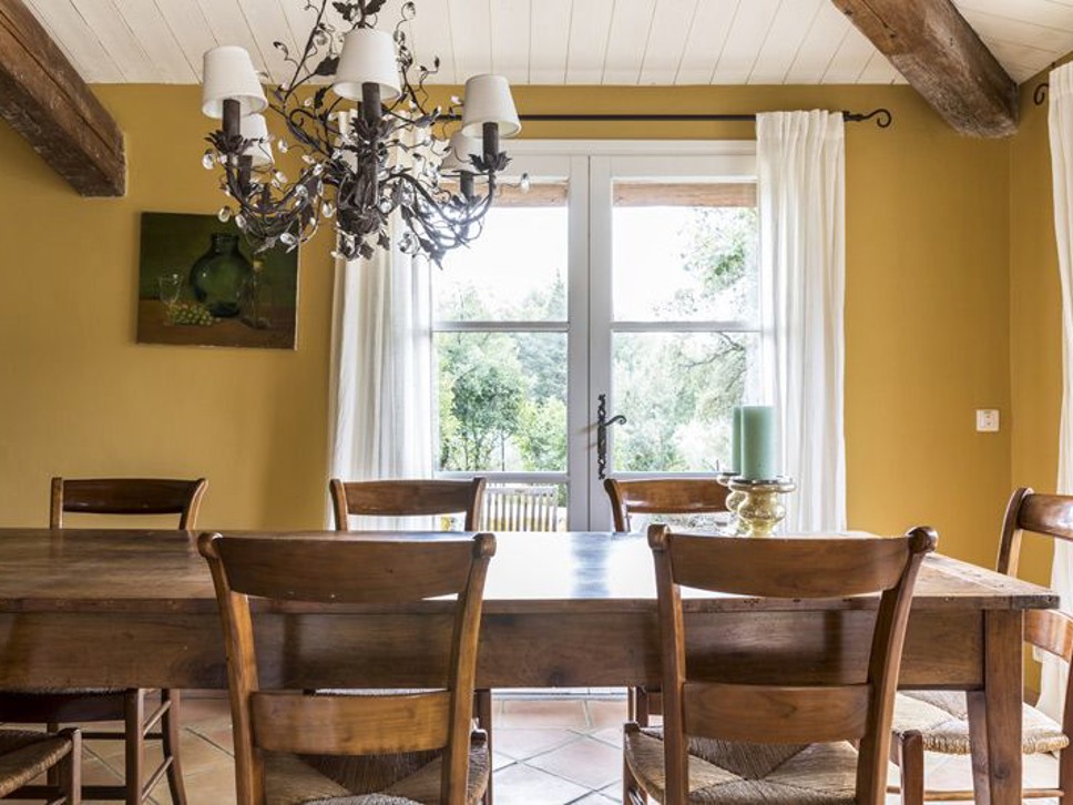 Aan de rechter zijde van de keuken bevindt zich de eetkamer. Er staat een grote eettafel. De eetkamer biedt toegang tot het overdekte terras.