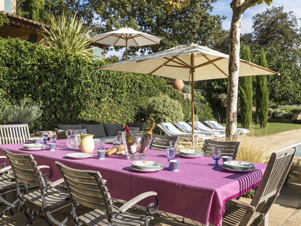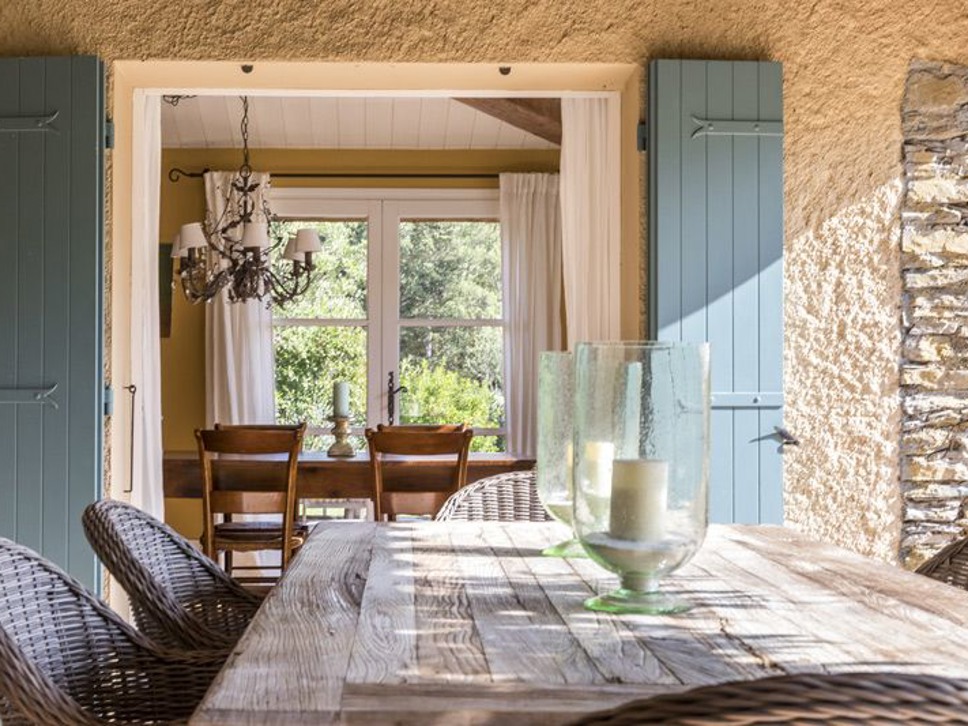 Een groot overdekt terras direct aan de villa biedt een heerlijke schaduwplaats voorzien van comfortabele zithoek en ruime eettafel en parasols. Kortom de plek om heerlijk lang te loungen, ontbijten, lunchen en dineren. Vanaf dit terras heeft u een volledig zicht op het zwembad.