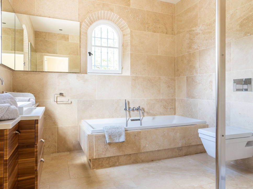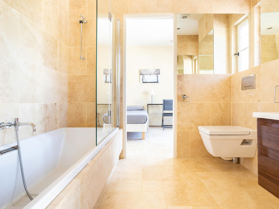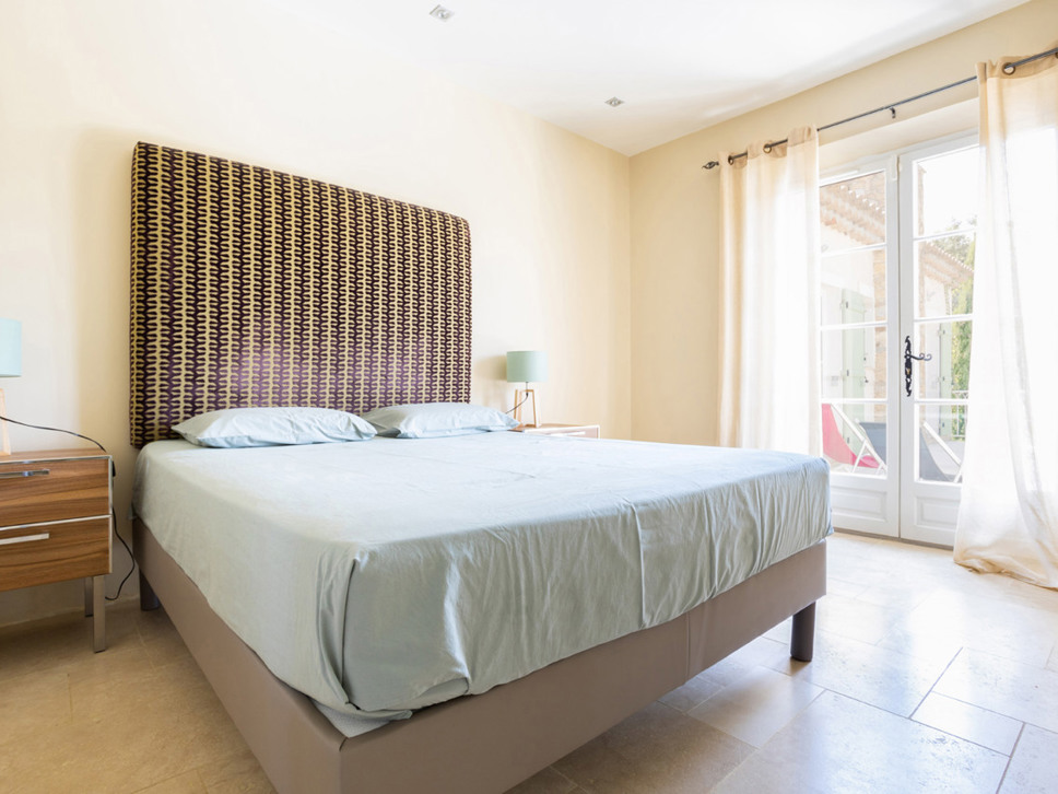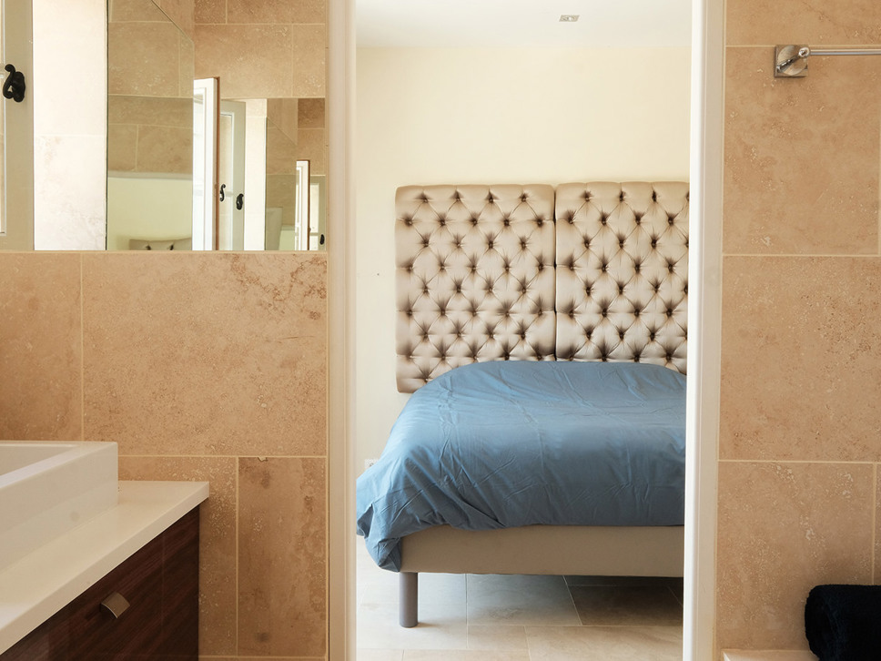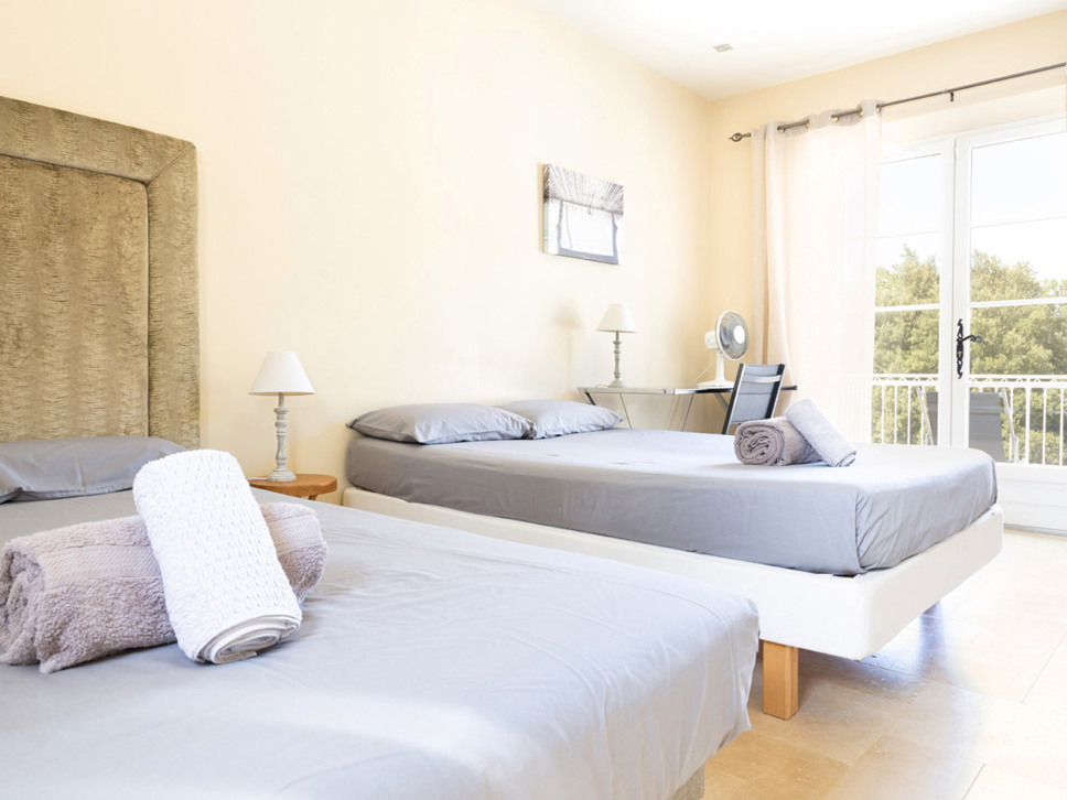 Slaapkamer 3, gelegen rechts van de grote trap, biedt tevens een tweepersoonsbed (180x200) en deelt de badkamer douche/bad en wastafel) met een kinderkamer waarop staan 2 bedden van 140x200. Slaapkamers 3 en 4 bieden openslaande deuren naar een ruim terras met zicht op het zwembad.