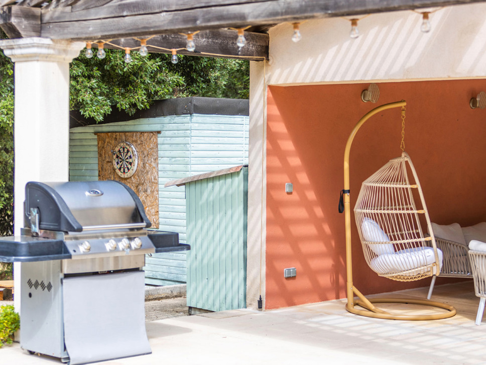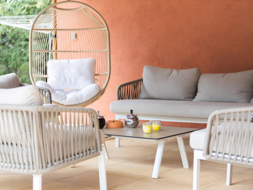 Een groot overdekt terras direct aan de villa biedt een heerlijke schaduwplaats voorzien van eettafel. Erg leuk vinden we het overdekte terras bij het zwembad. Hier staat een comfortabele loungeset vanwaar goed zicht op het zwembad. Direct naast het zwembad staan de ligbedden, hier kunt u de hele dag van de zon genieten. Ook met parasol (niet op de foto).