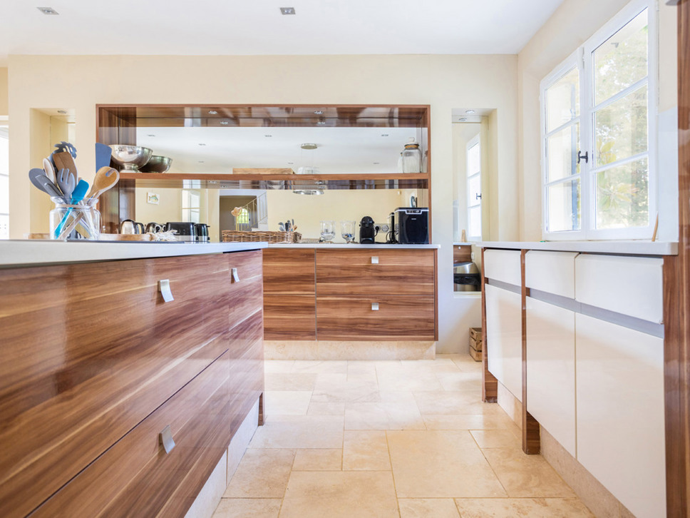 De woonkeuken is ruim en luxe. Modern ingericht en voorzien van een Amerikaanse koelkast / vriezer, vaatwasser, 4-pits electrische kookplaat, magnetron, oven en filterkoffiezetapparaat. Ook vanuit de keuken heeft u direct toegang tot het overdekte terras. Ideaal om 's ochtends buiten te ontbijten!