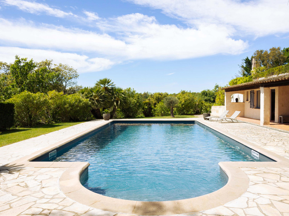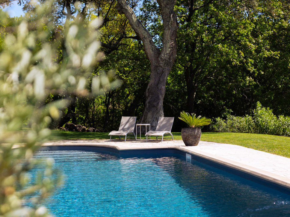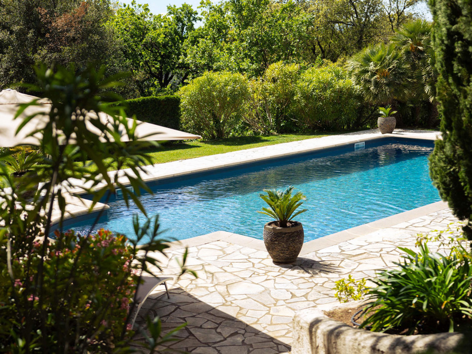 Het zwembad ligt een niveau lager en is voorzien van een zonneterras en een poolhouse met zitbank in de schaduw. (Hier bevindt zich ook slaapkamer 5).
