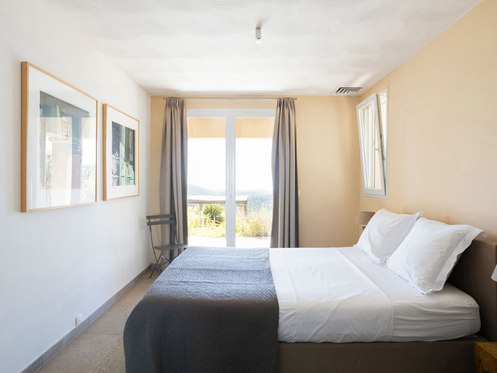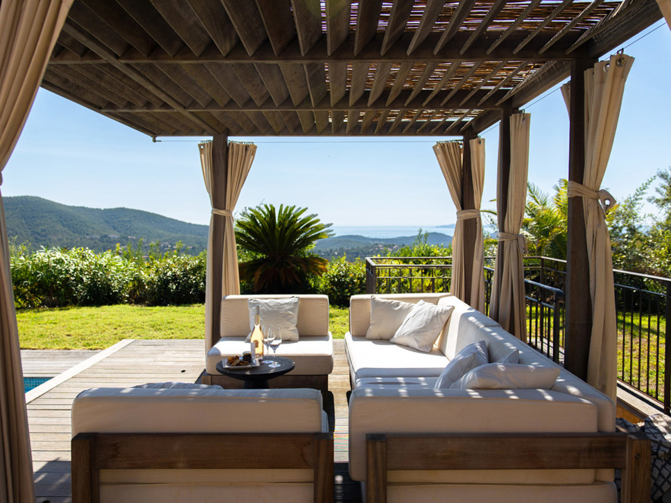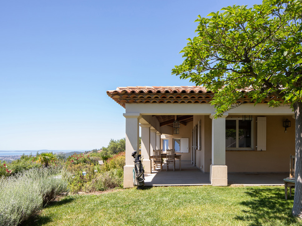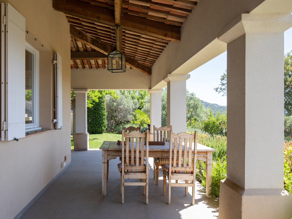 Vanuit de living bieden openslaande deuren toegang tot het terras, tuin en zwembad. Vanaf het terras is er een wijds zicht richting Middellandse Zee en eilanden Iles de Porquerolles. Vanuit de luxe keuken komt u via openslaande deuren op het schaduwrijke overdekte terras met eettafel.