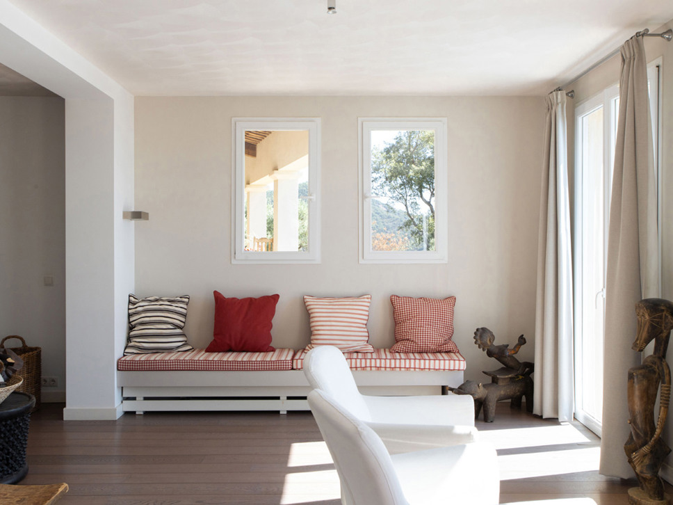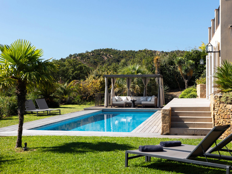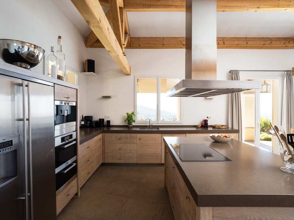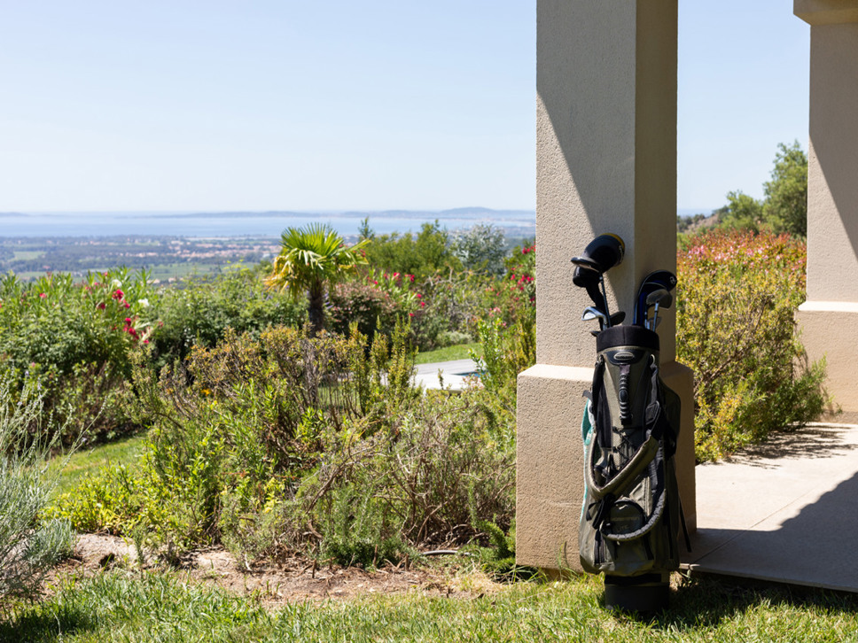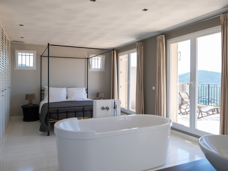 Vanuit de living bieden openslaande deuren toegang tot het terras, tuin en zwembad. Vanaf het terras is er een wijds zicht richting Middellandse Zee en eilanden Iles de Porquerolles. Vanuit de luxe keuken komt u via openslaande deuren op het schaduwrijke overdekte terras met eettafel.
