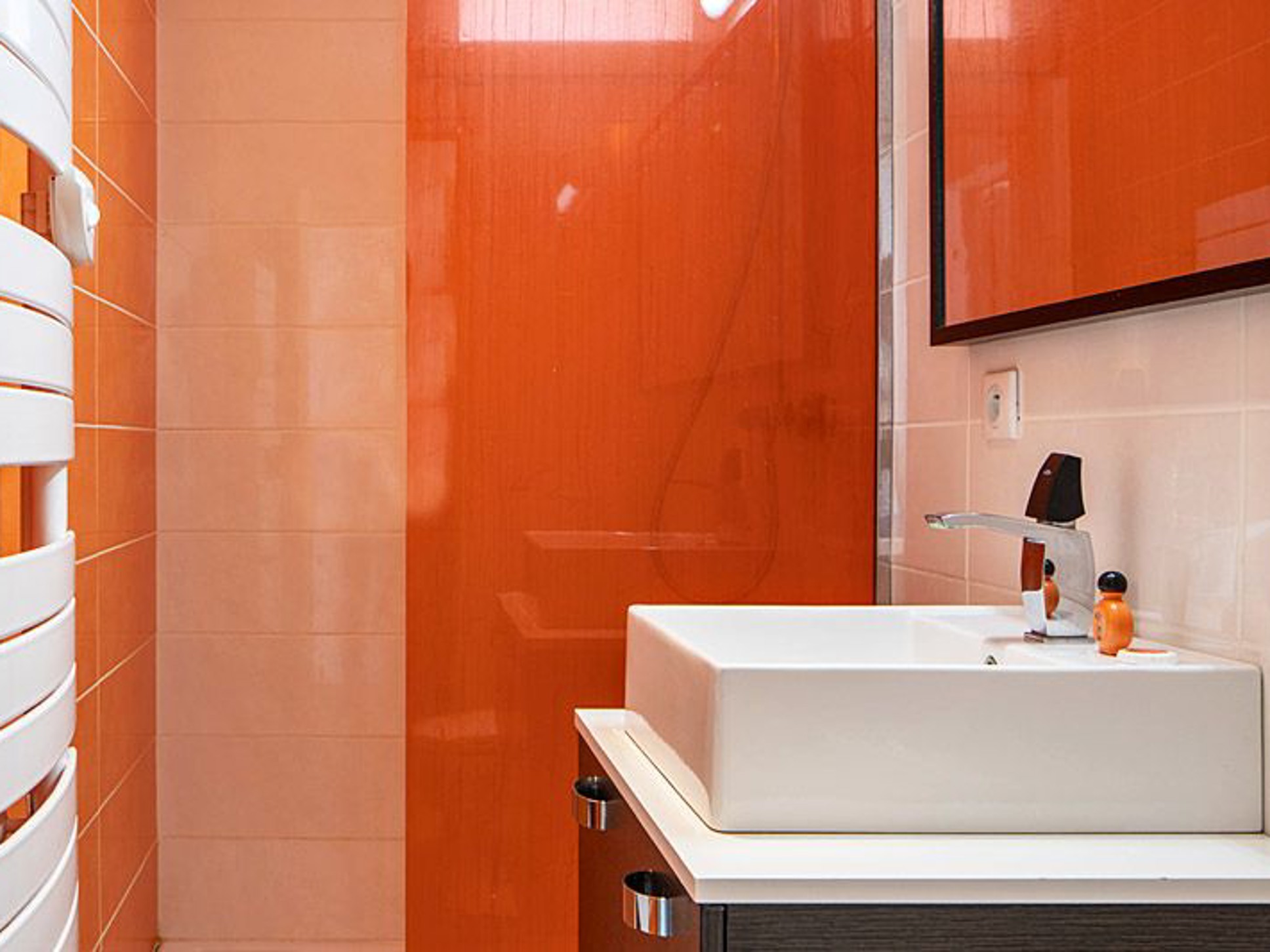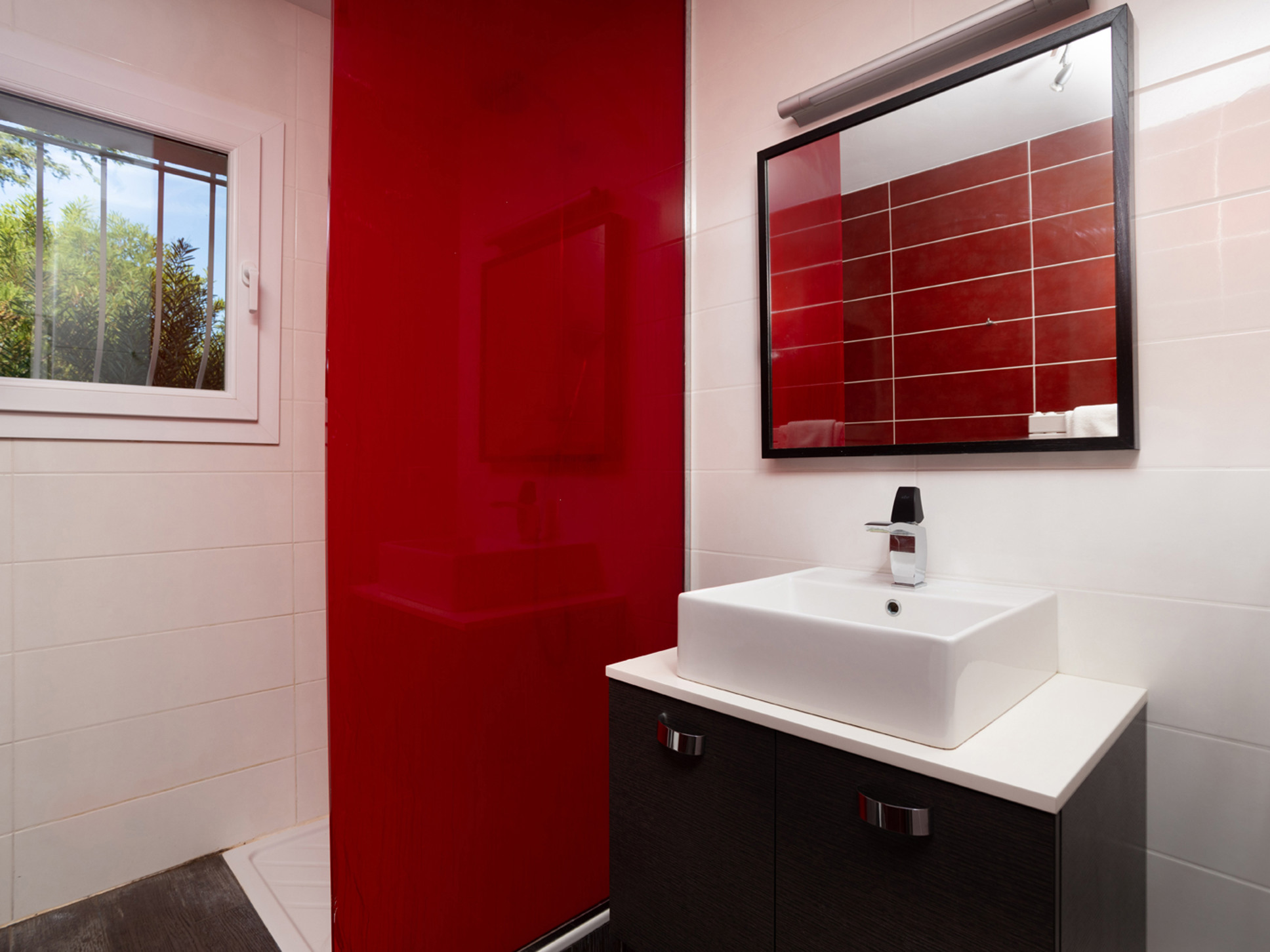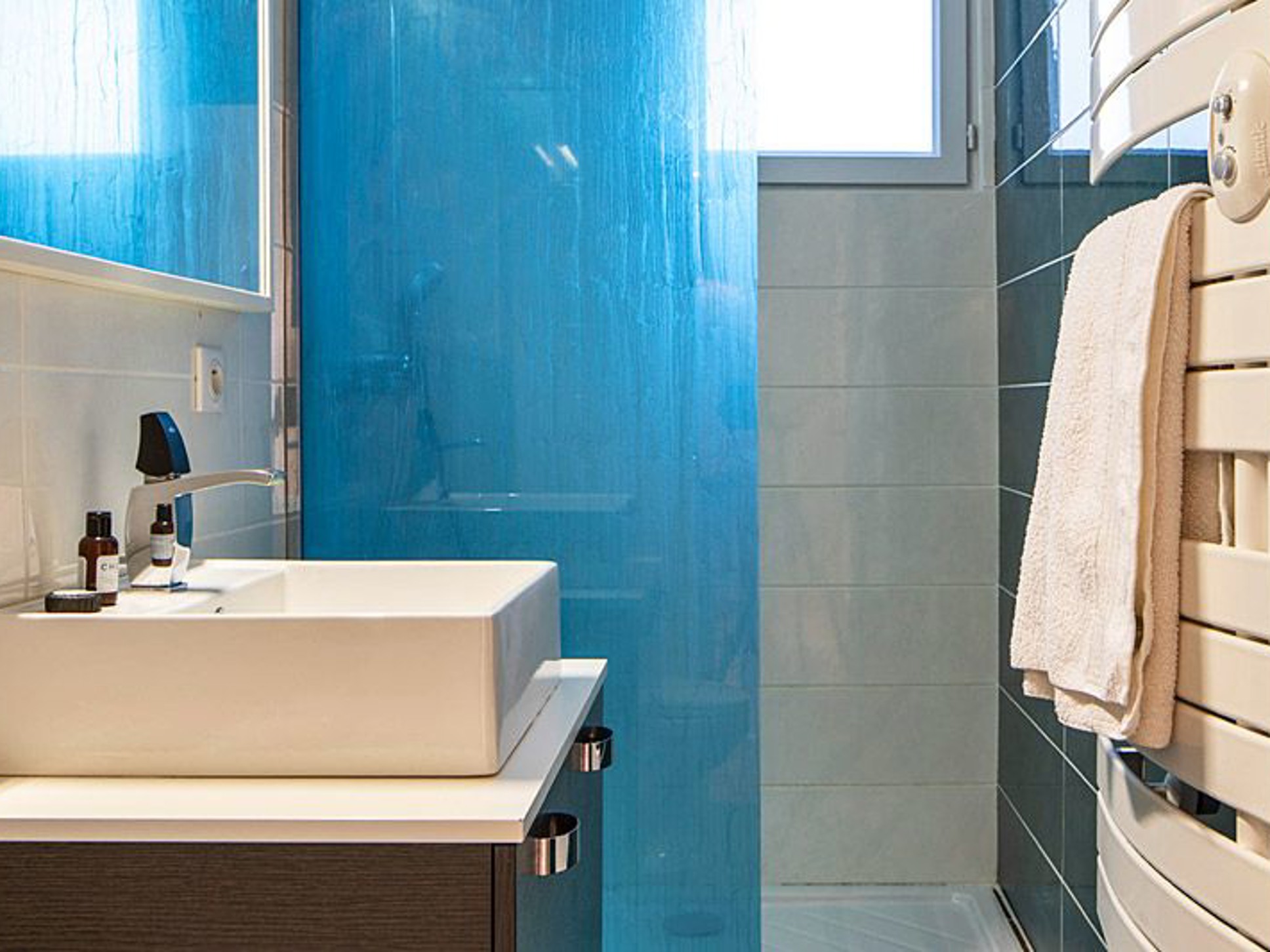 Slaapkamer 4. bevindt zich op het niveau van de living. Het bed is tweepersoonsbed (160x200) en de badkamer is privé (wastafel en douche).