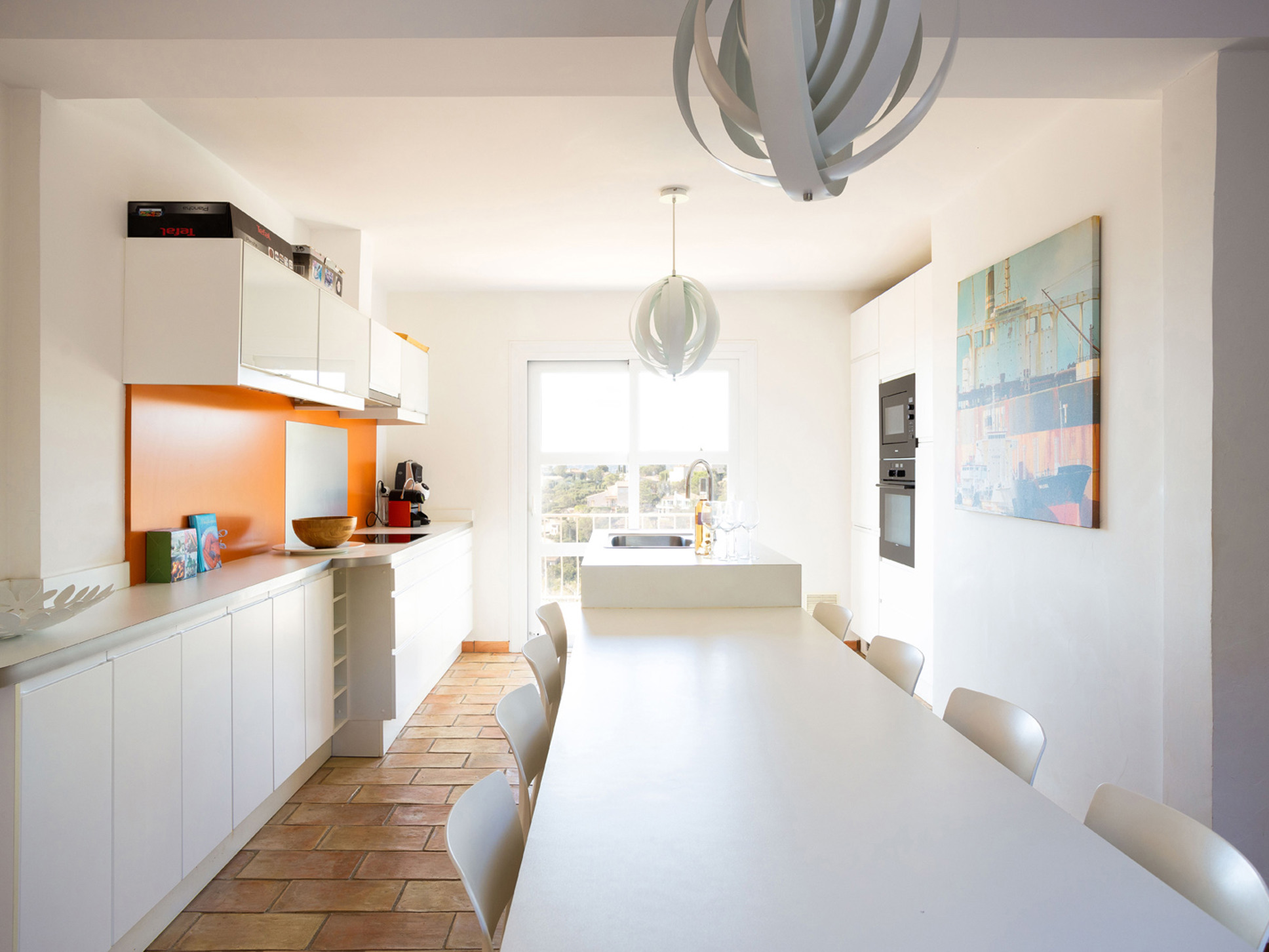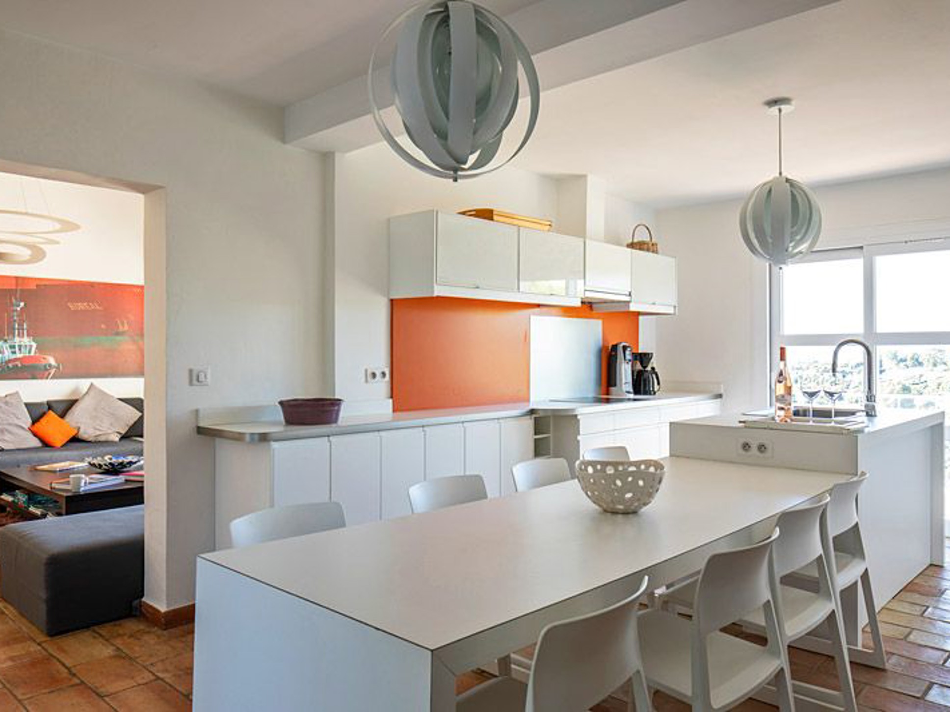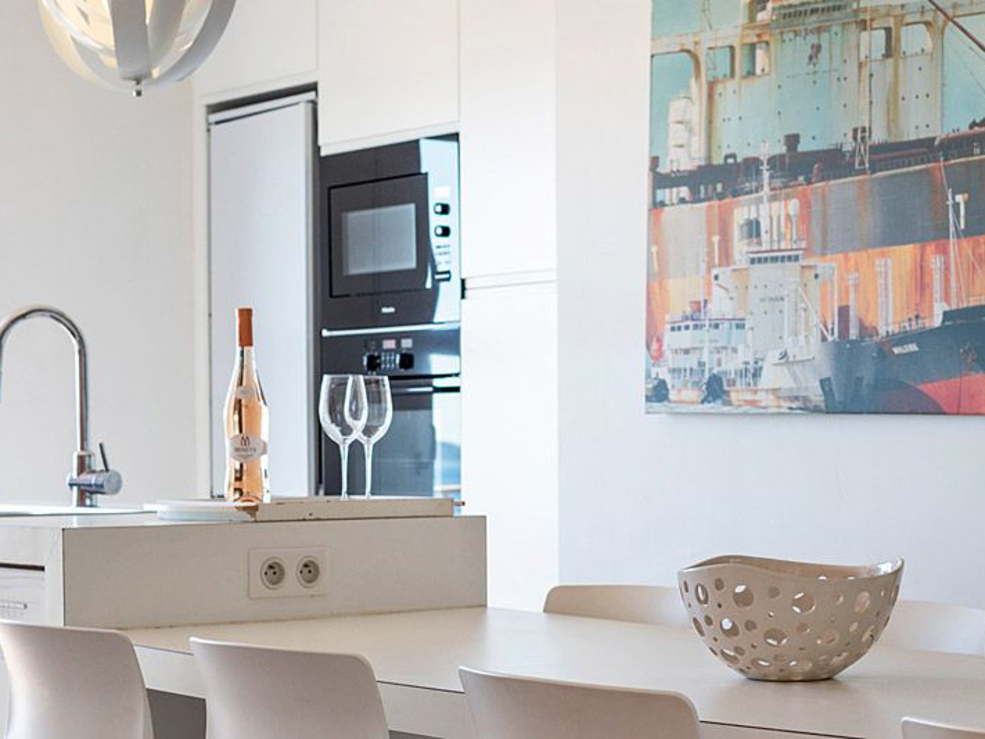 De moderne keuken is compleet ingericht en beschikt o.a. over een vaatwasser, oven, koel-vriescombinatie, extra ruime wijn koelkast, magnetron, kookplaat, plancha, Nespresso apparaat en een waterkoker. Erg mooi vinden we de eettafel die aan het eiland vastzit. Vanuit de living en keuken is er een rechtstreekse toegang tot een groot terras met zonnescherm en een grote eettafel.