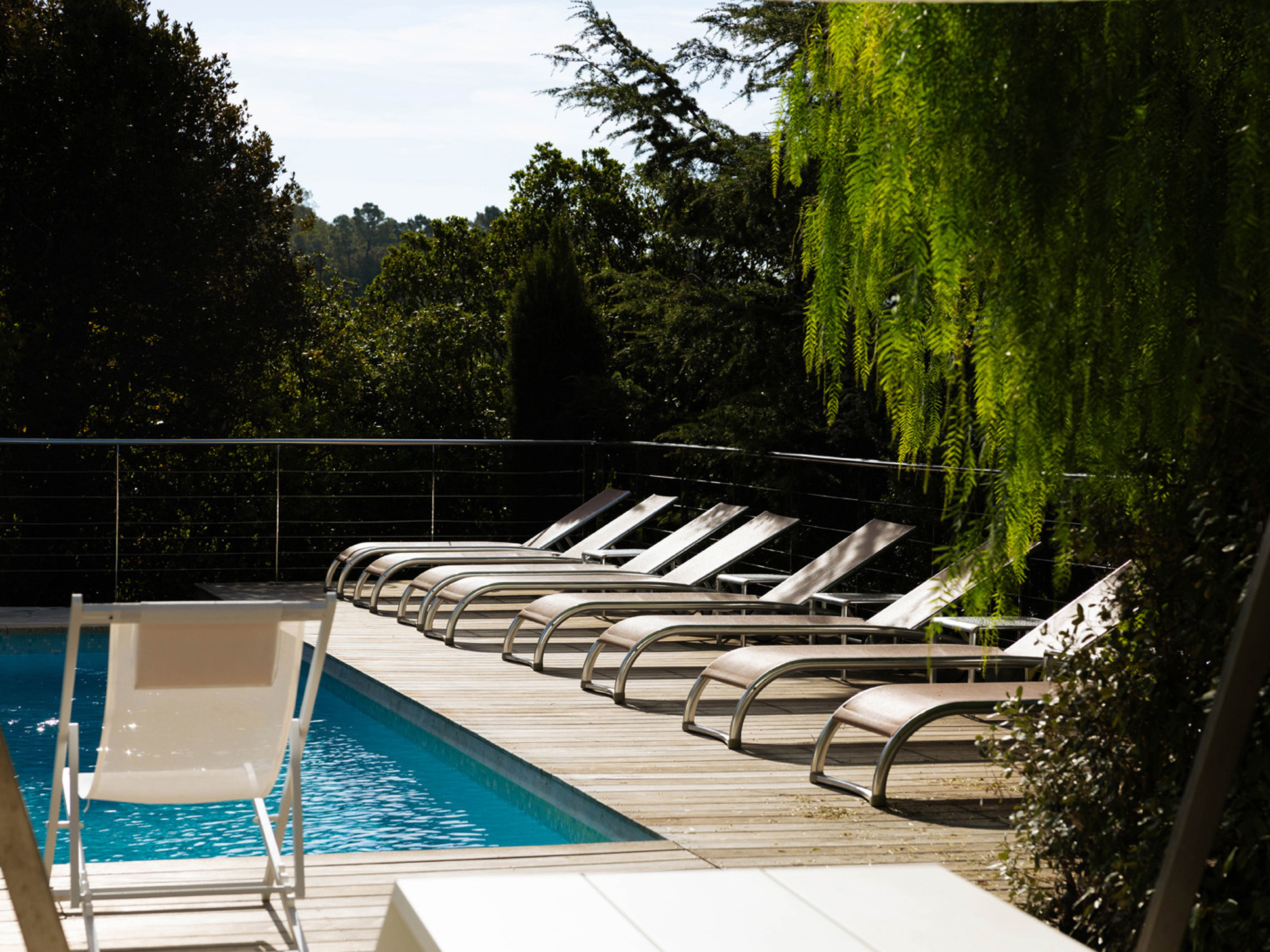 Eén verdieping lager, bereikbaar via een trap, liggen het zwembad (9x4) en de buitenkeuken. Dankzij de ligging op het zuiden zijn de villa en het zwembad optimaal zonnig. Rond het zwembad ligt een houten terras met 10 luxe ligbedden – de ideale plek om te ontspannen en te genieten van de zon. Naast het zwembad bevindt zich een groot terras met buitenkeuken en een schaduwrijk zitgedeelte.