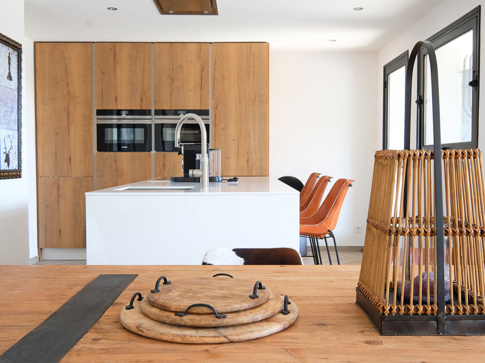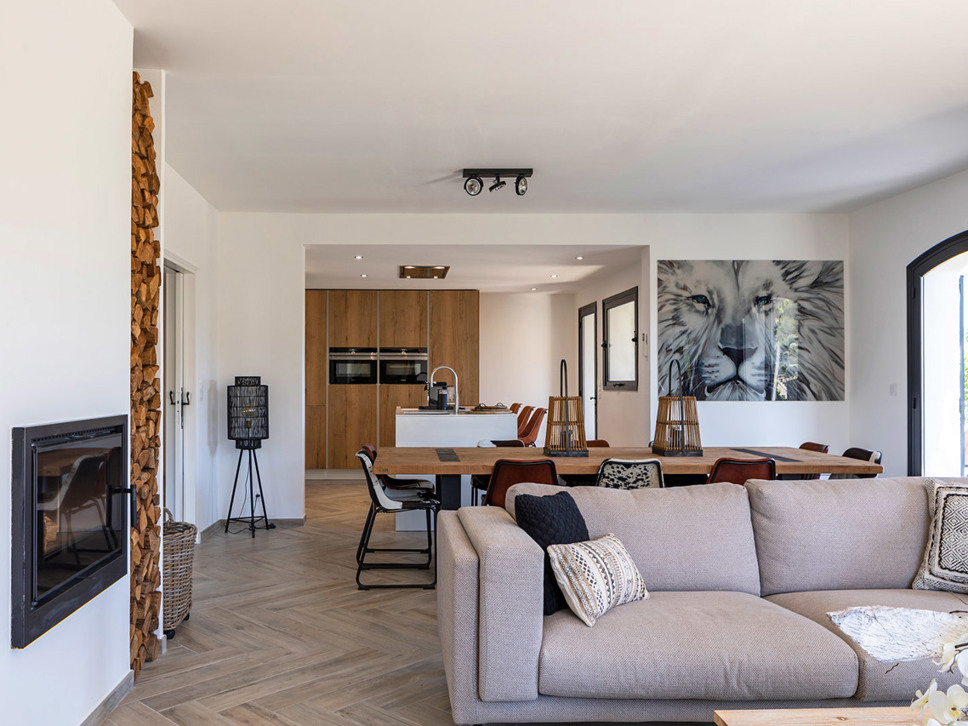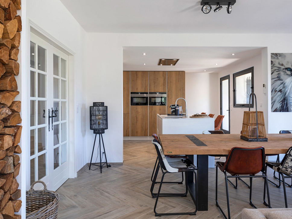 Tussen de living en de keuken in staat de ruime eettafel. De eettafel met gietijzeren, lederen stoelen en de houten buffetkast geven dit geheel een industriële look. Openslaande deuren geven toegang tot het terras. De moderne open keuken is praktisch ingericht, zo is deze o.a. voorzien van een koelkast, vaatwasser, Nespresso apparaat en uiteraard een oven voor vers afgebakken croissants in de ochtend.