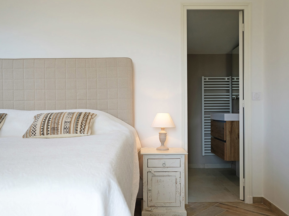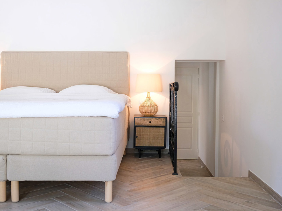 Slaapkamer 4 is uitgerust met een tweepersoonsbed (160x200)en biedt toegang tot een kleiner privé terras met wederom een zicht op zee. Slaapkamer 4 maakt gebruik van een separate badkamer (wastafel, douche). Ook bevindt er zich een separaat W.C. op deze verdieping.