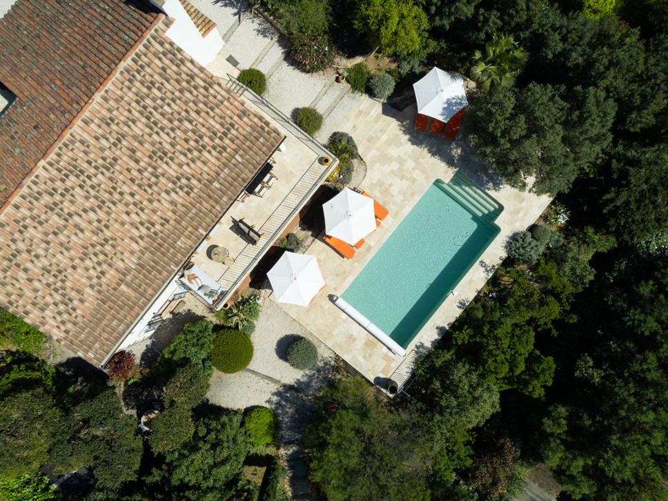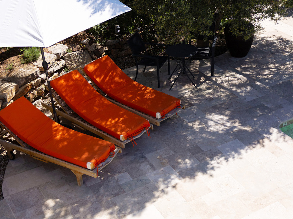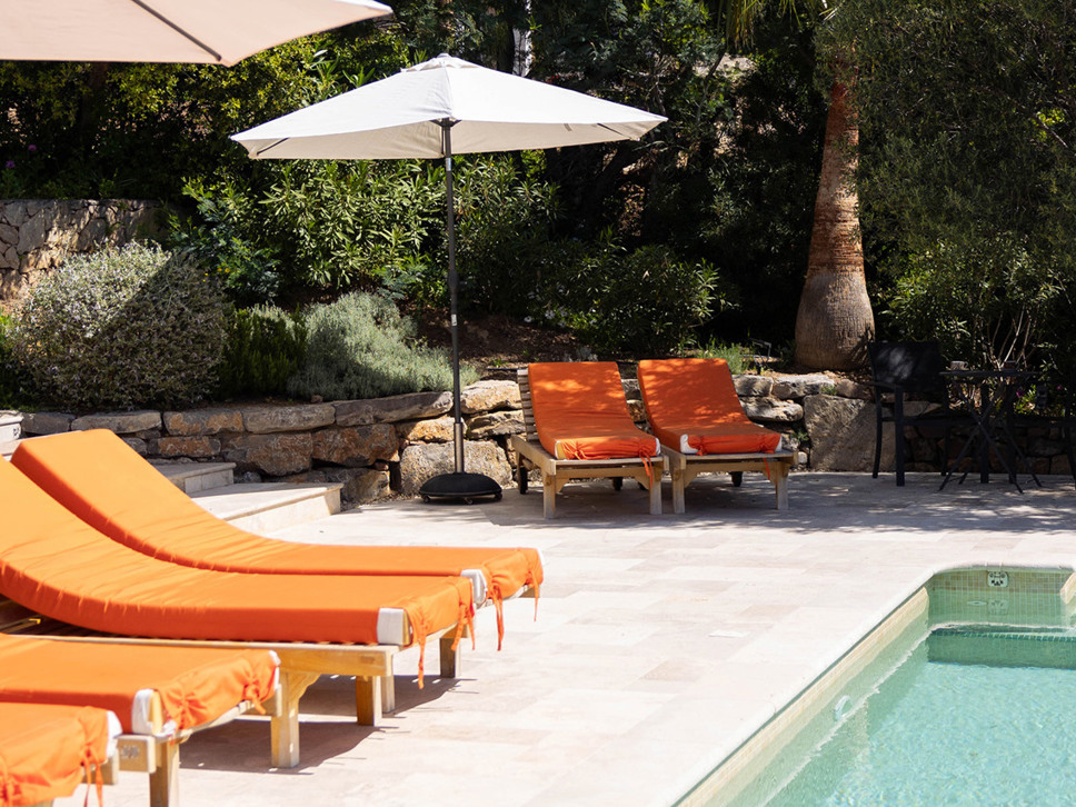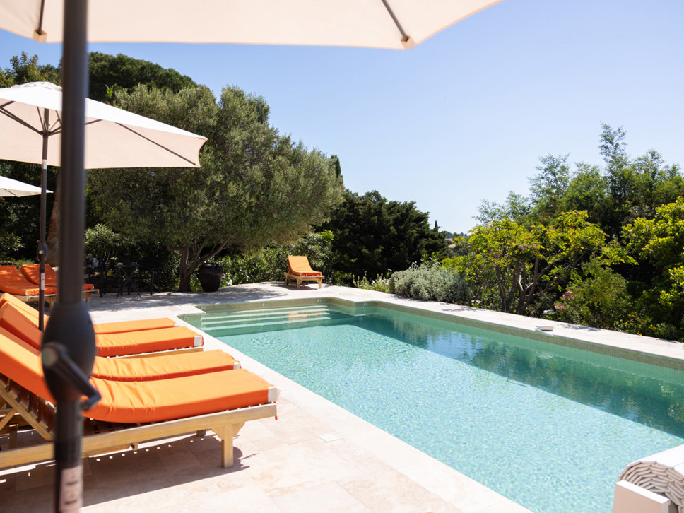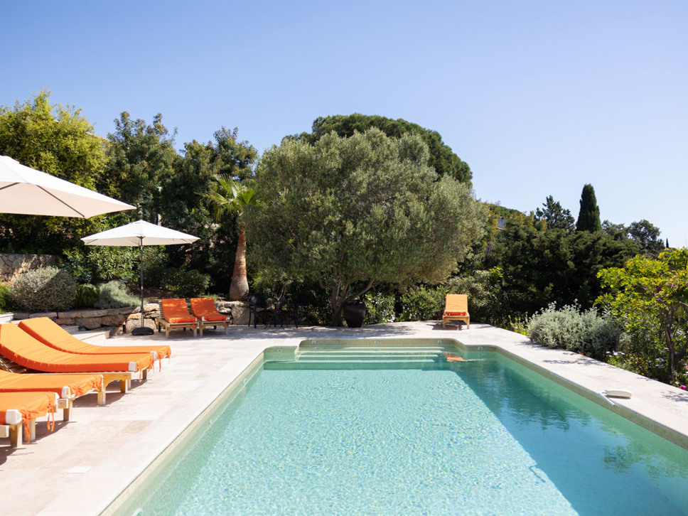Het zwembad (9 x 4 m en 1.6 m diep) bevindt zich een niveau lager en is voorzien van een romeinse trap en een zwembadalarm. Er zijn 8 comfortabele ligstoelen alsook parasols aanwezig.