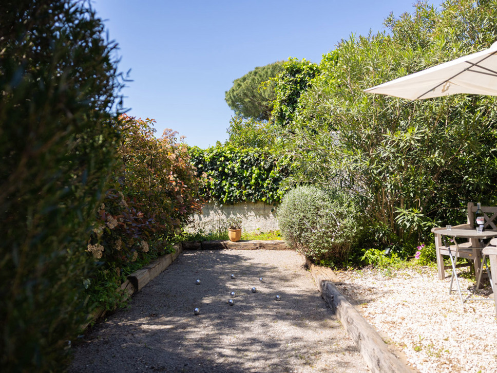 Ietsje lager in de tuin ligt de petanquebaan. Altijd leuk om aan het eind van de middag een spelletje te spelen onder het genot van een aperitief. De tuin is voorzien van een electrische poort. U kunt de auto parkeren op het eigen terrein.
