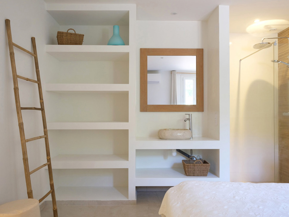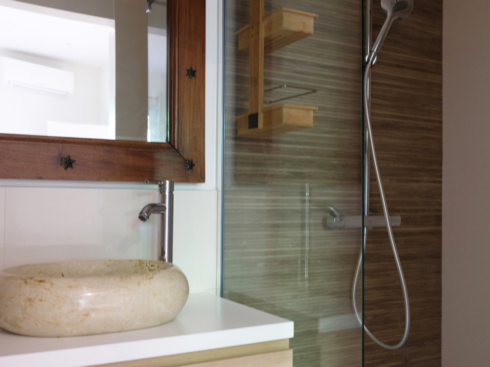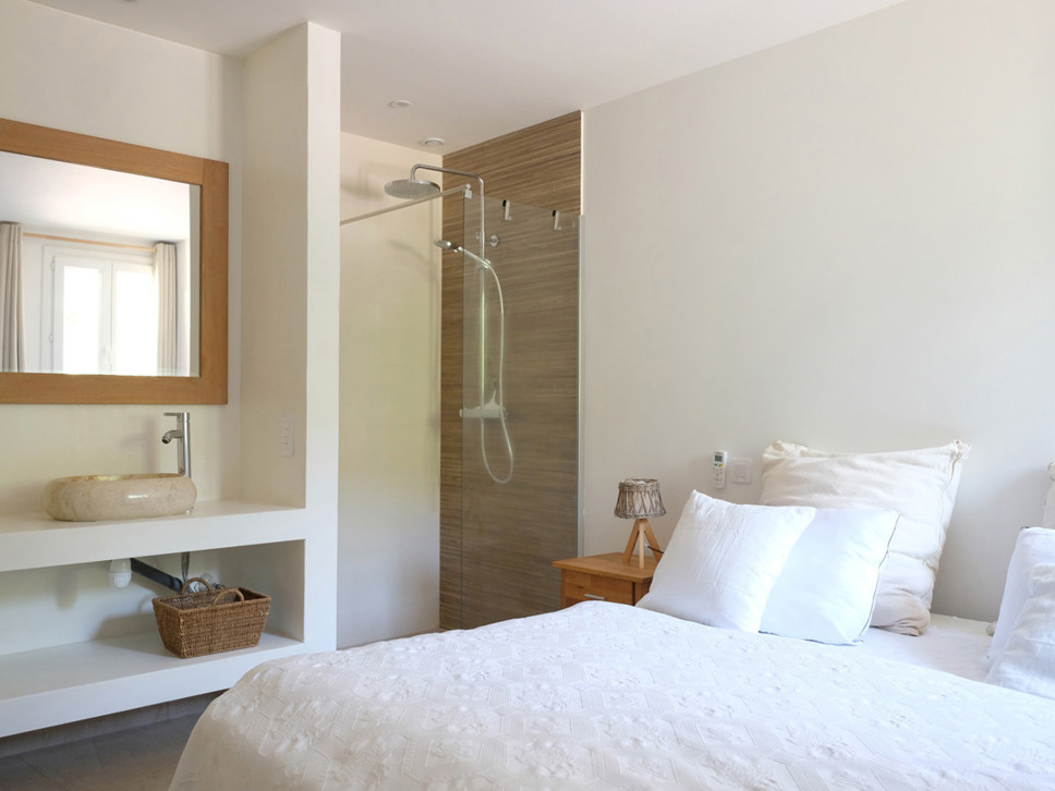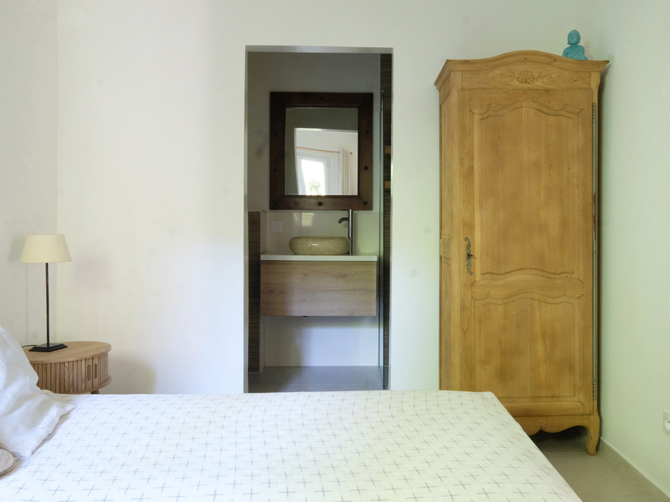 Het privézwembad (8 x 4 m, diepte van 0.90 tot 2.40 m) is direct toegankelijk vanaf het terras. Aan de ene korte zijde staan ligbedden en parasols, terwijl aan de andere zijde een comfortabele loungeset staat, vanwaar u zelfs een glimp van zee kunt opvangen. Een buitendouche is eveneens aanwezig.